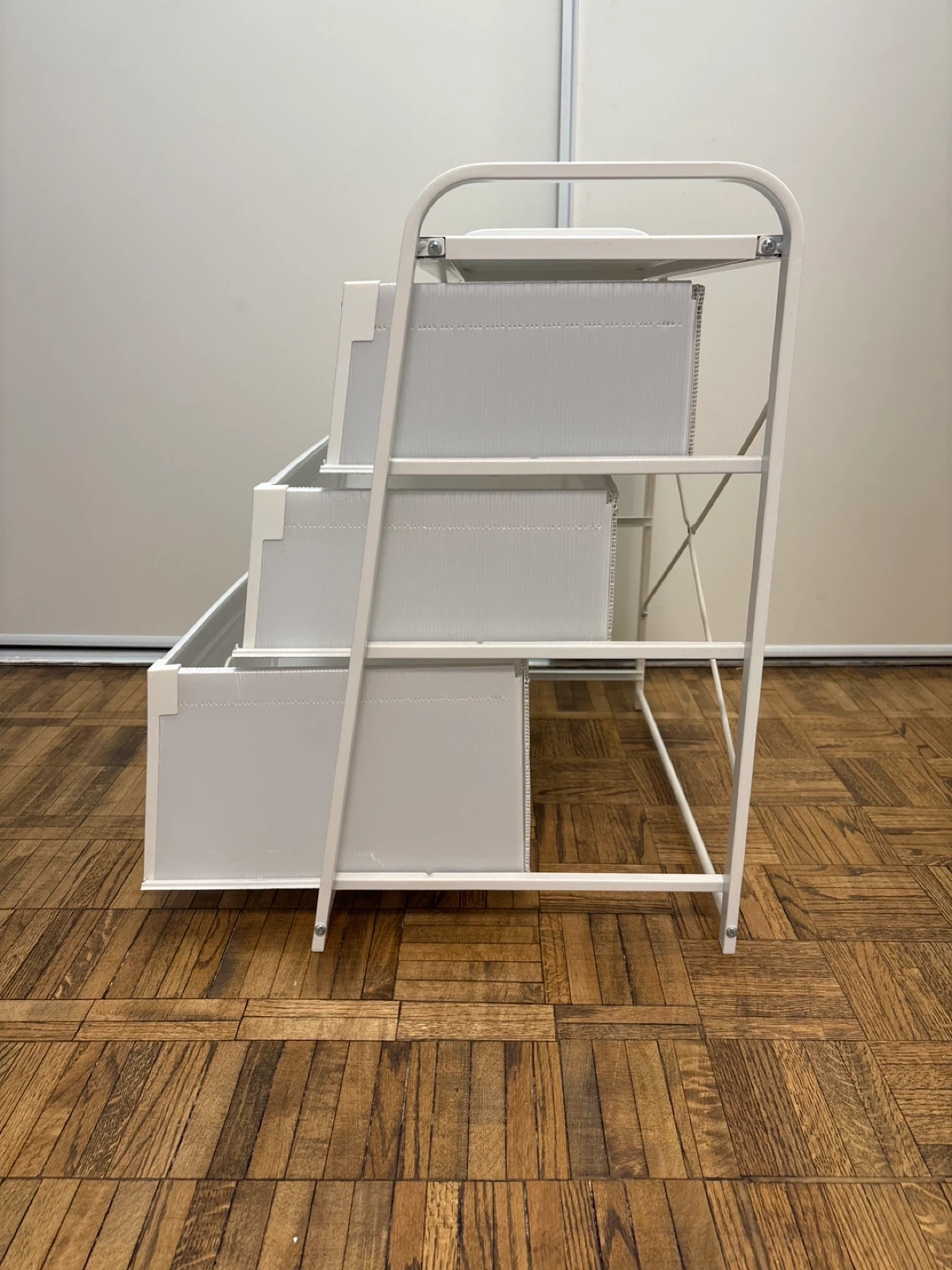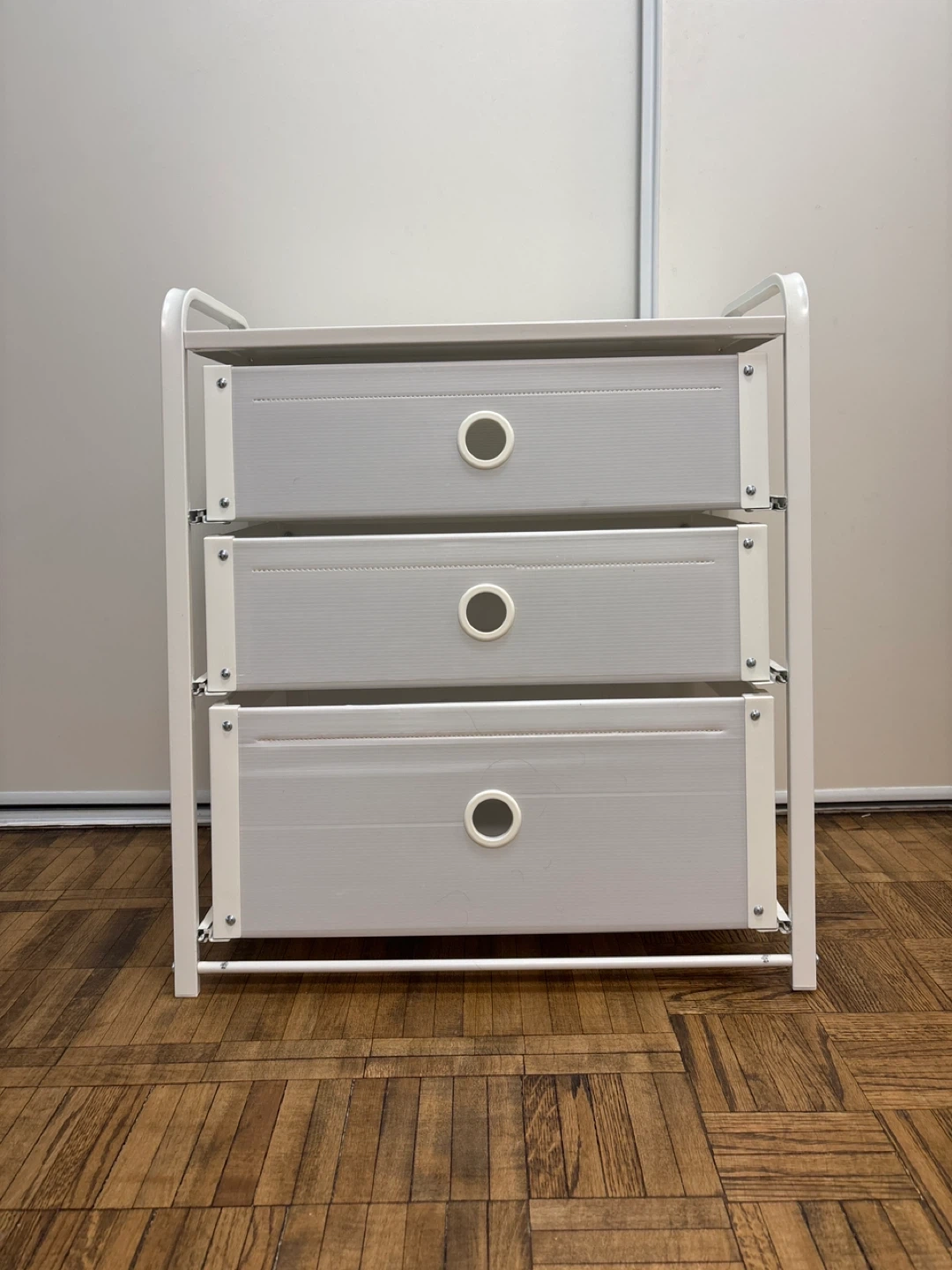 A handy white metal-framed storage unit with three drawers. It's great for organizing small items. The drawers slide out easily.