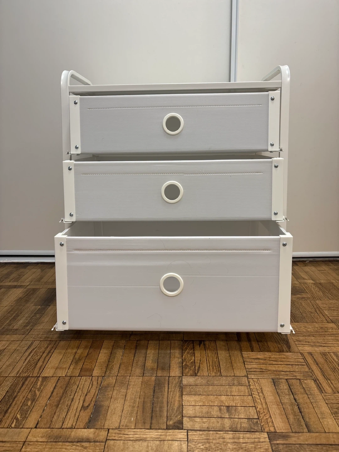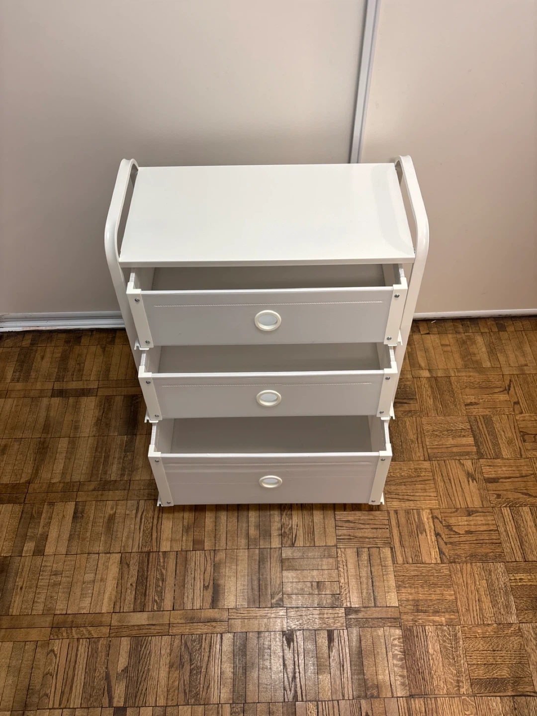 A handy white metal-framed storage unit with three drawers. It's great for organizing small items. The drawers slide out easily.