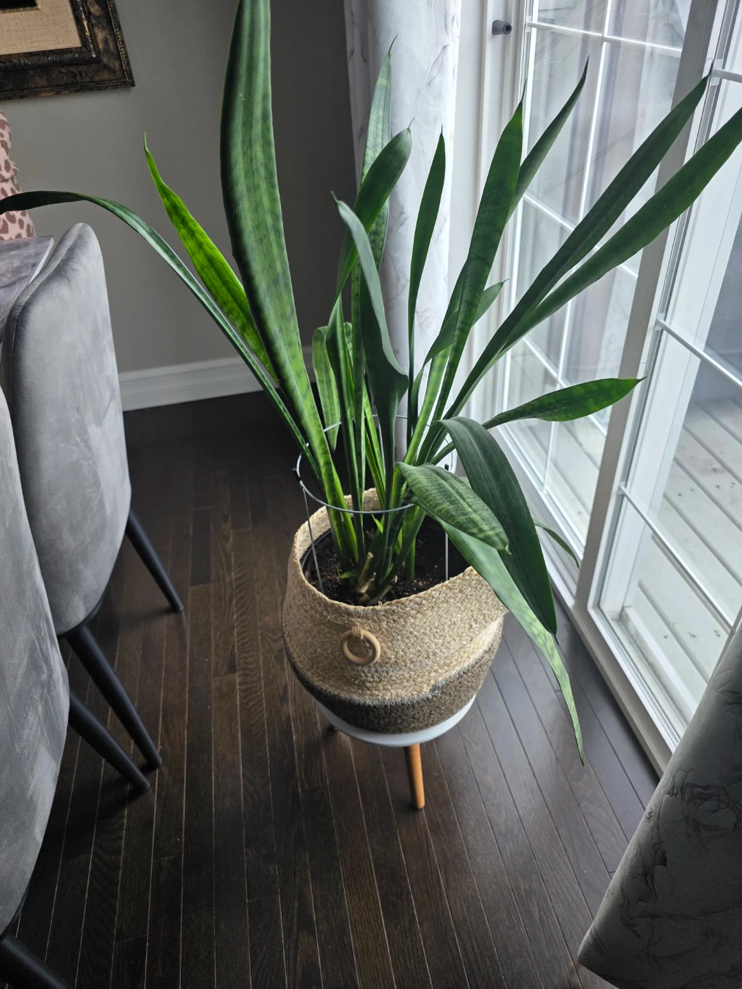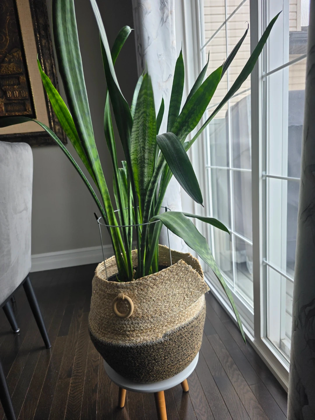 Healthy snake plant in a stylish woven basket planter. It's a low-maintenance houseplant. The planter has a neutral colour scheme with wood accents.