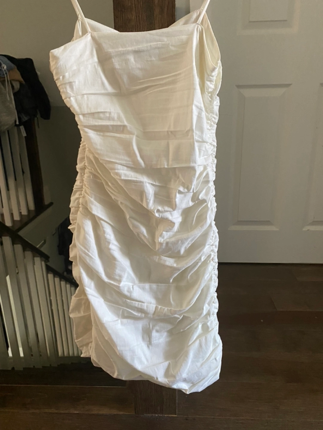 Selling a cute white ruched dress from Zara! It's a size XS and made in Morocco. Perfect for a night out or a summer day. The dress is in great condition!