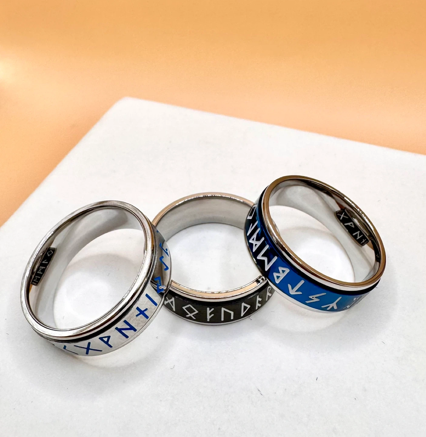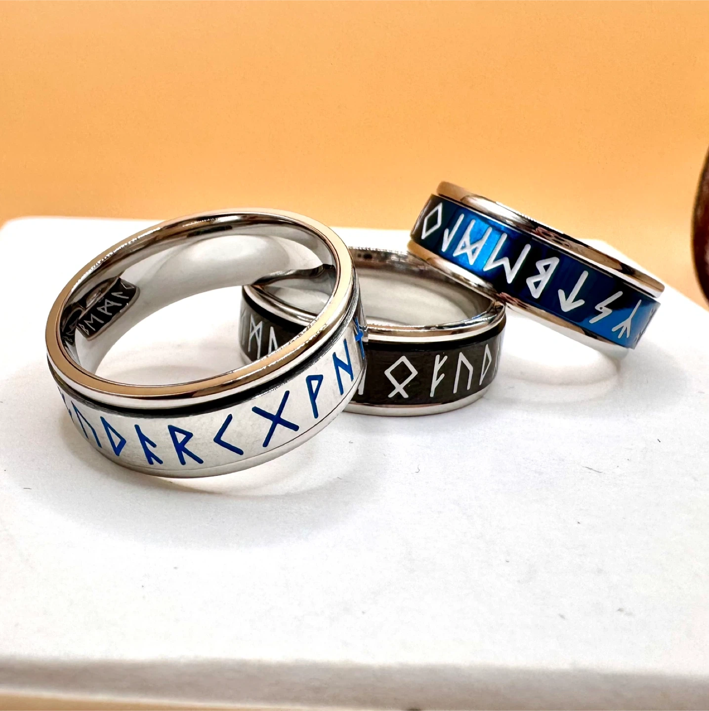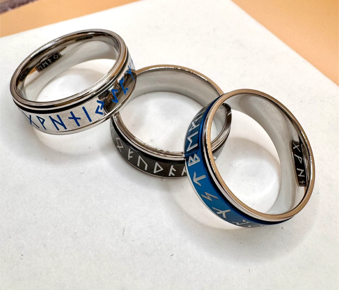 stainless steel spinner rings featuring Viking runes. One ring has a blue enamel inlay with runes, another has a black inlay with runes, and the third is plain silver with runes engraved. These rings have a smooth, polished finish.