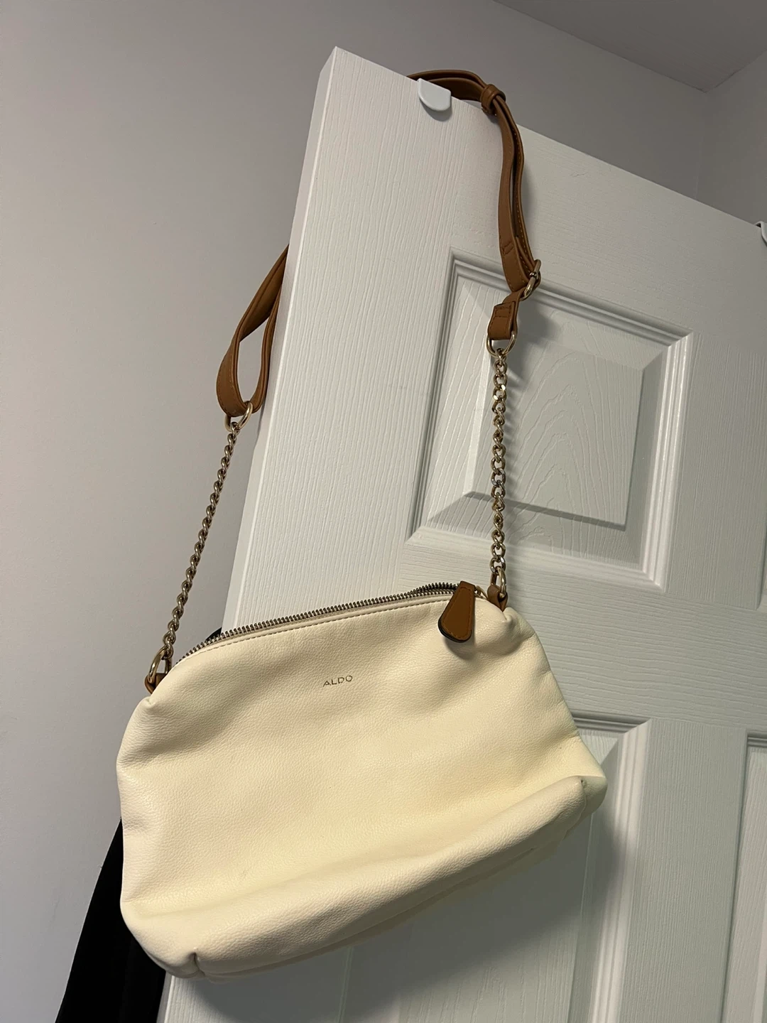 This is an ALDO cream-coloured crossbody bag. It features a stylish chain strap with faux leather accents. The bag has a zippered closure for security.