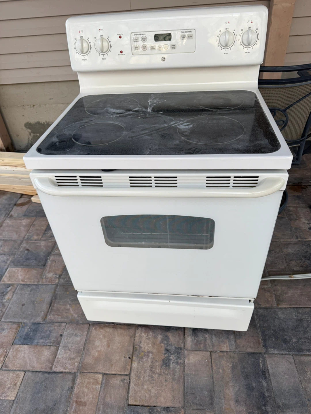 Selling a GE electric range/stove. It's white and has a glass top. Great for cooking all your favorite meals!