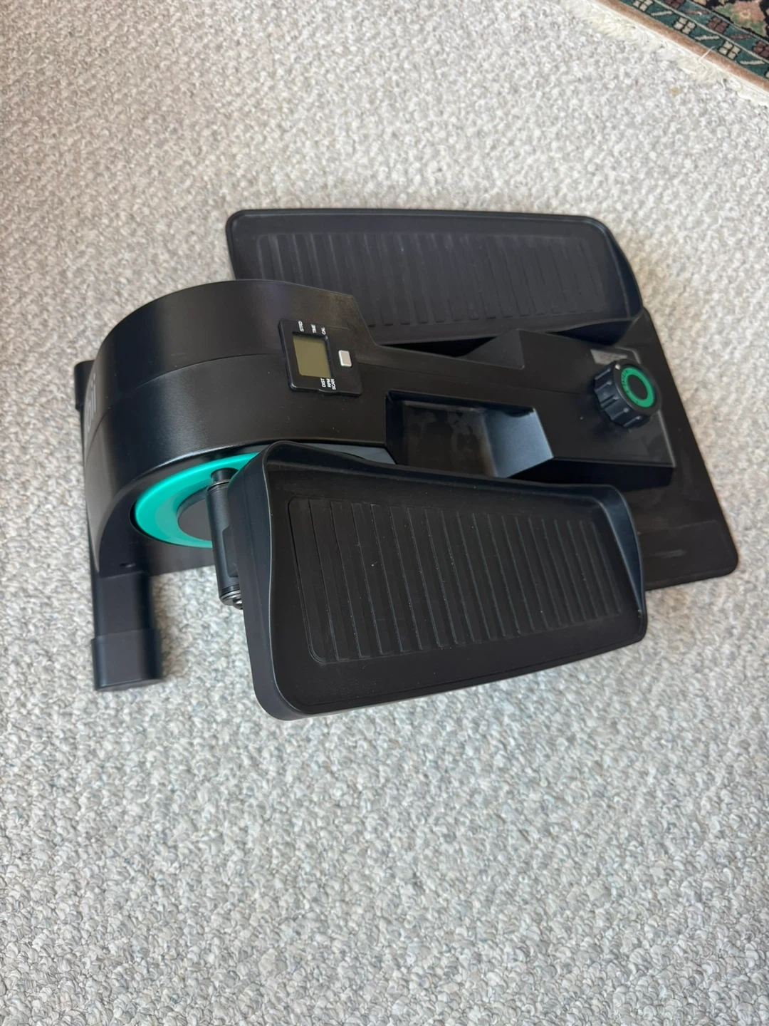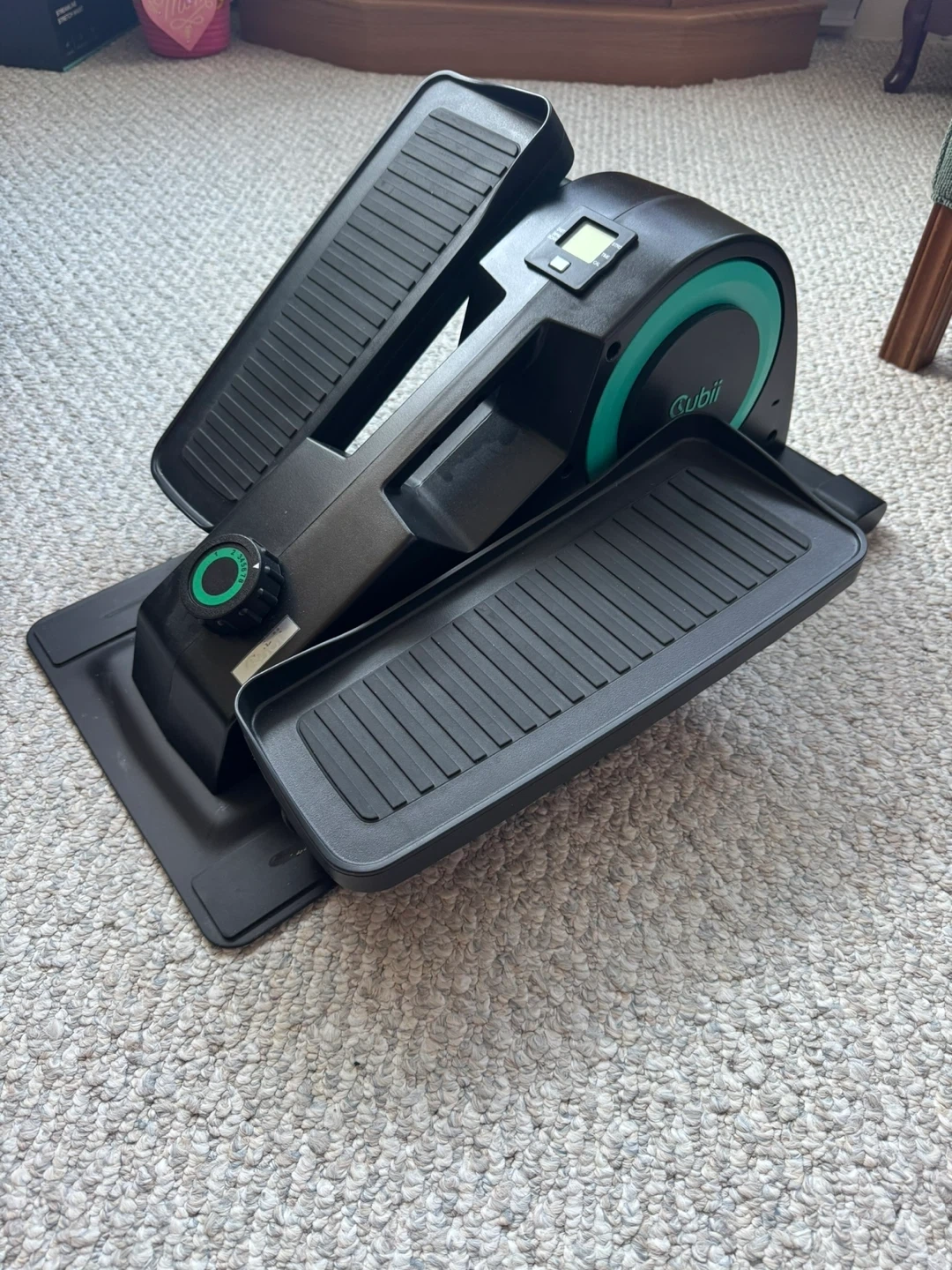 This is a Cubii under-desk elliptical in black with teal accents. It's designed for low-impact workouts while seated. The unit has a small digital display and adjustable resistance.