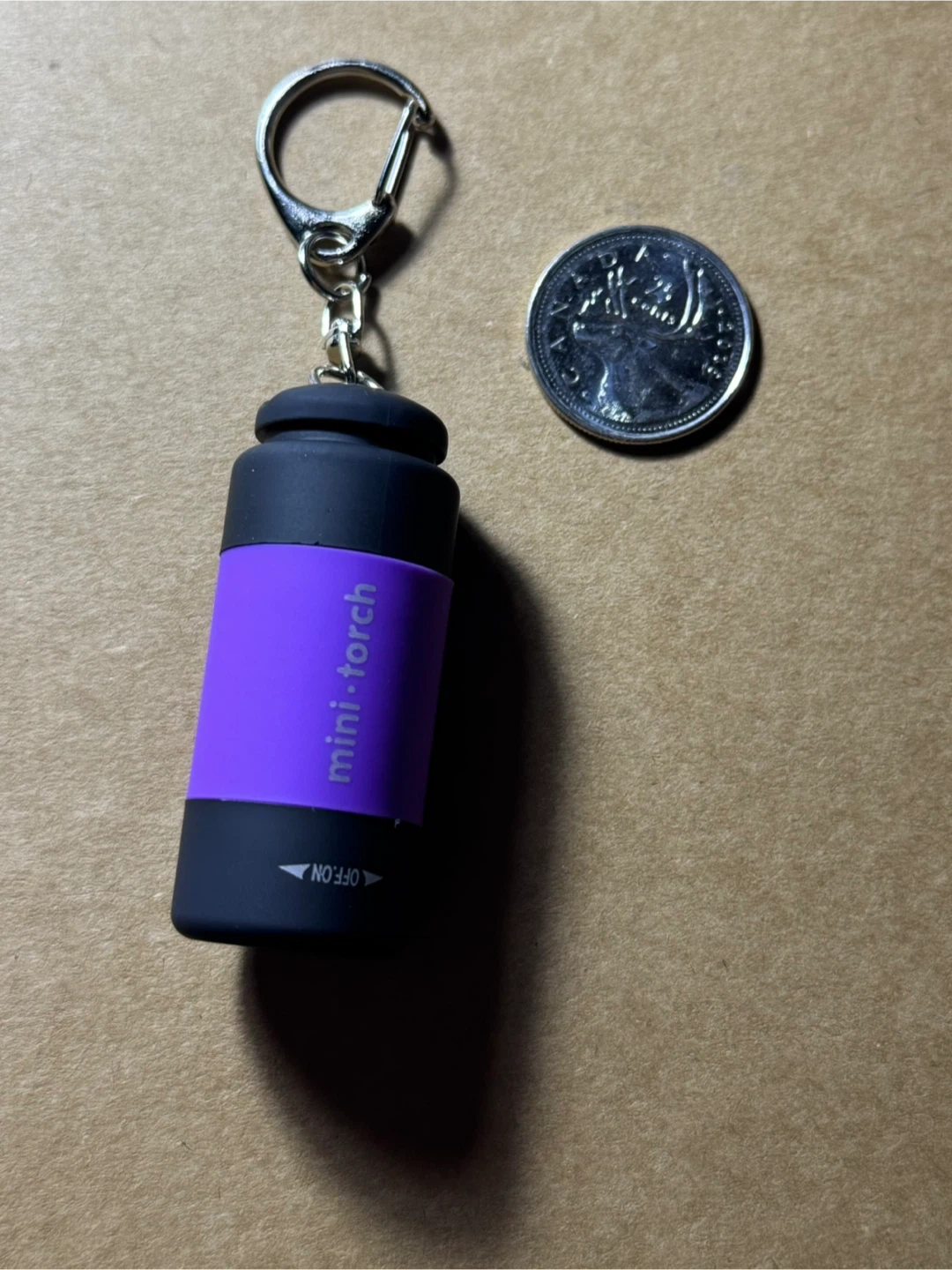 This is a mini torch keychain flashlight. It's purple and black with a keyring attachment. The flashlight has an on/off twist function. It's small enough to fit on your keys! It charges via the usb attached.