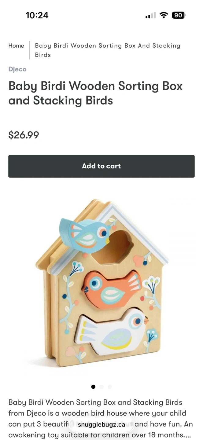 This Djeco Baby Birdi is a wooden sorting and stacking toy. It's a bird house with three colourful wooden birds. Recommended for ages 18 months and up. My daughter never used it. It’s in excellent condition