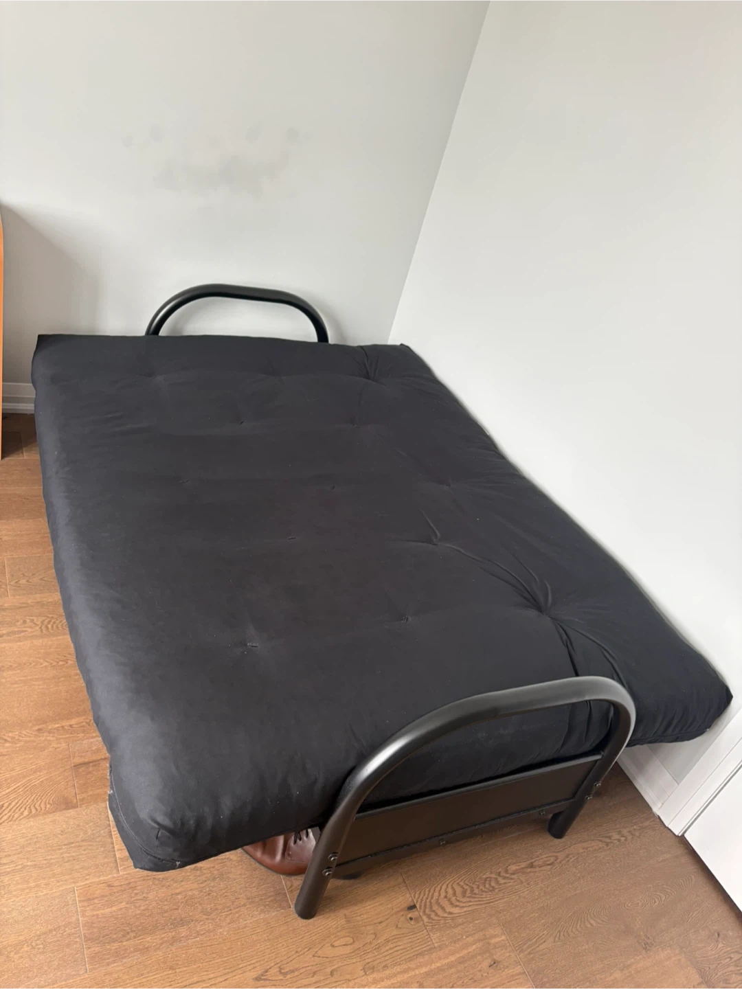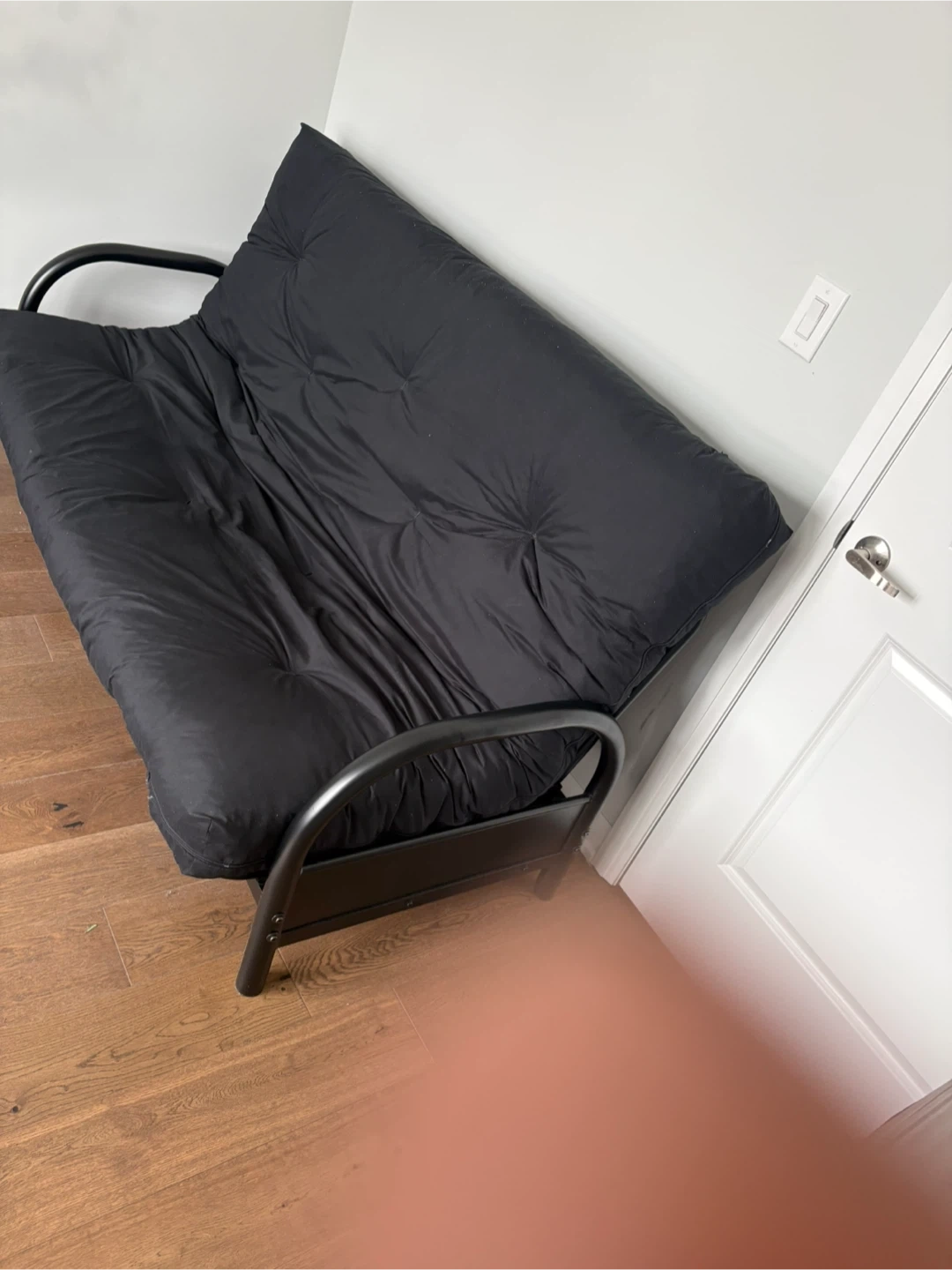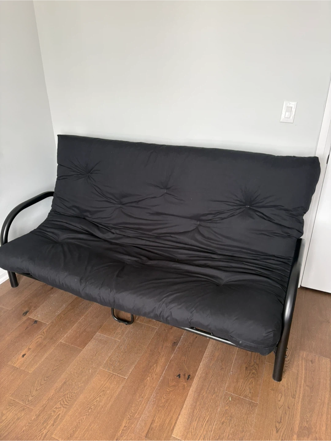 This is a black futon sofa bed. It's made with a metal frame and a tufted mattress. It easily converts from a sofa to a bed. This futon is great for small spaces or guest rooms! I bought this 3 months ago for $530 , now I got to move can’t bring it with me. Come and pickup asap. Make a fair offer