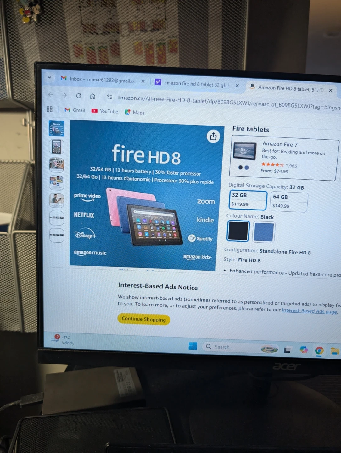 This is an Amazon Fire HD 8 tablet. It's black and has 32 GB of storage. It offers 13 hours of battery life.