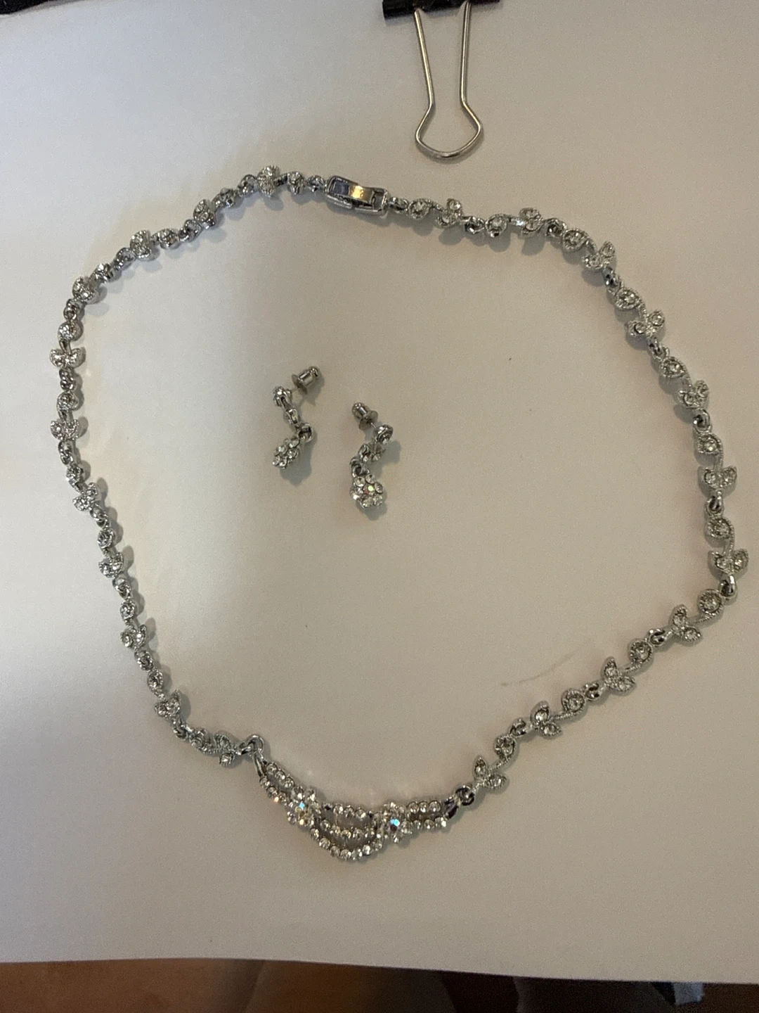 Sparkly silver-tone necklace and matching earrings adorned with rhinestones. This set features a delicate leaf and vine design.