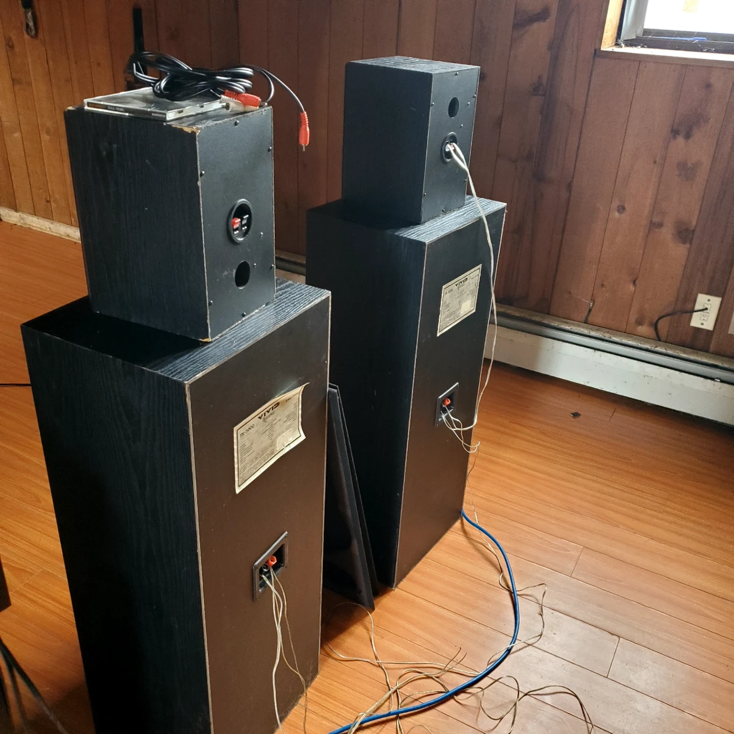 Yamaha natural sound AV receiver RX-V765 and a Sony CD player with a JBL PSM-120 subwoofer plus a DVD player. The receiver supports Dolby Digital and DTS. The subwoofer features a 12" woofer and adjustable frequency response. Also included are Vivid Reference 3-way tower speakers with 10" woofers plus two small speakers for surround sound style.