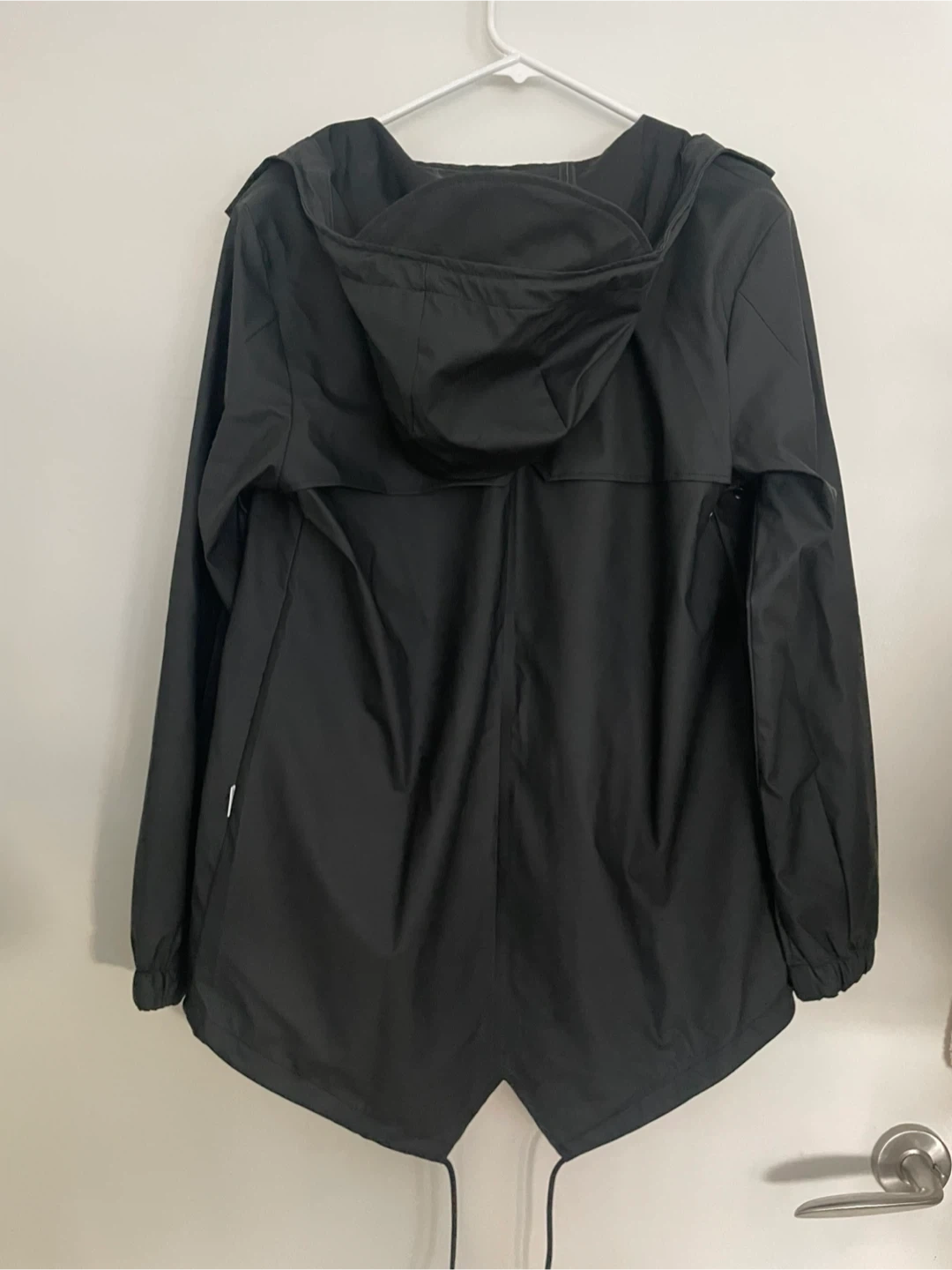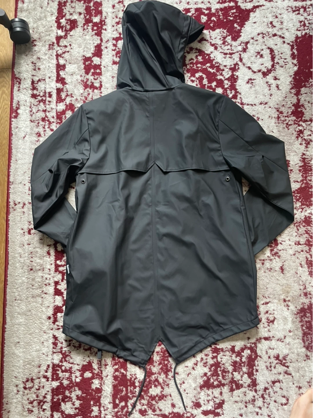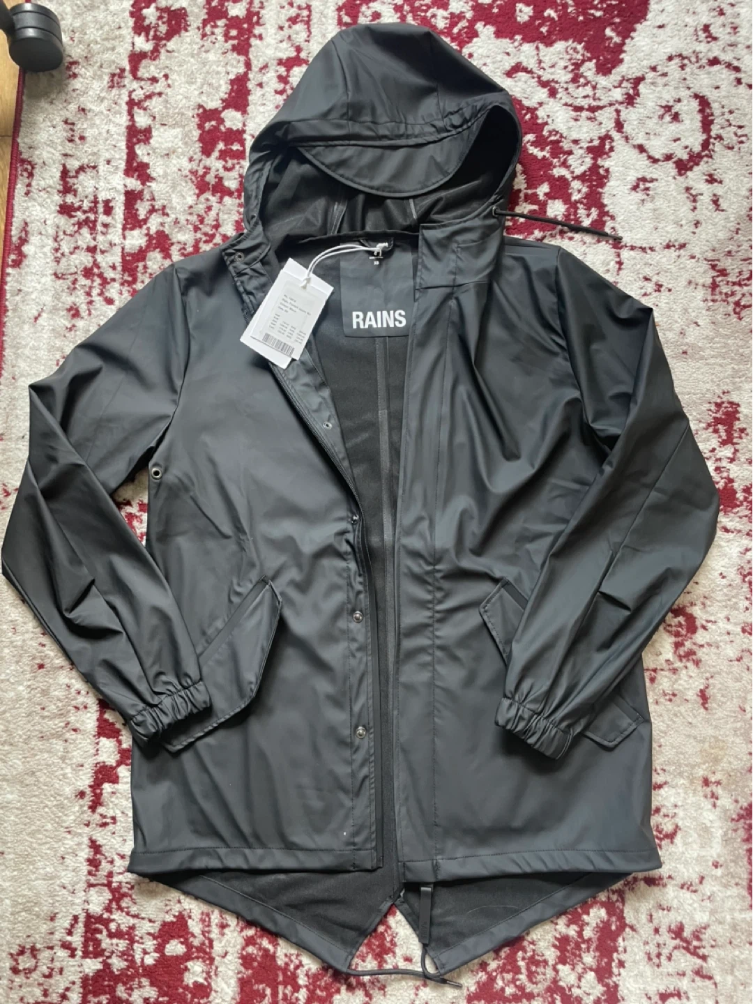 Selling a brand new Rains Fishtail Jacket W3 in black, size XS! This stylish jacket is perfect for rainy days. It's in great condition and ready for a new home! The jacket features a hood and a unique fishtail design.