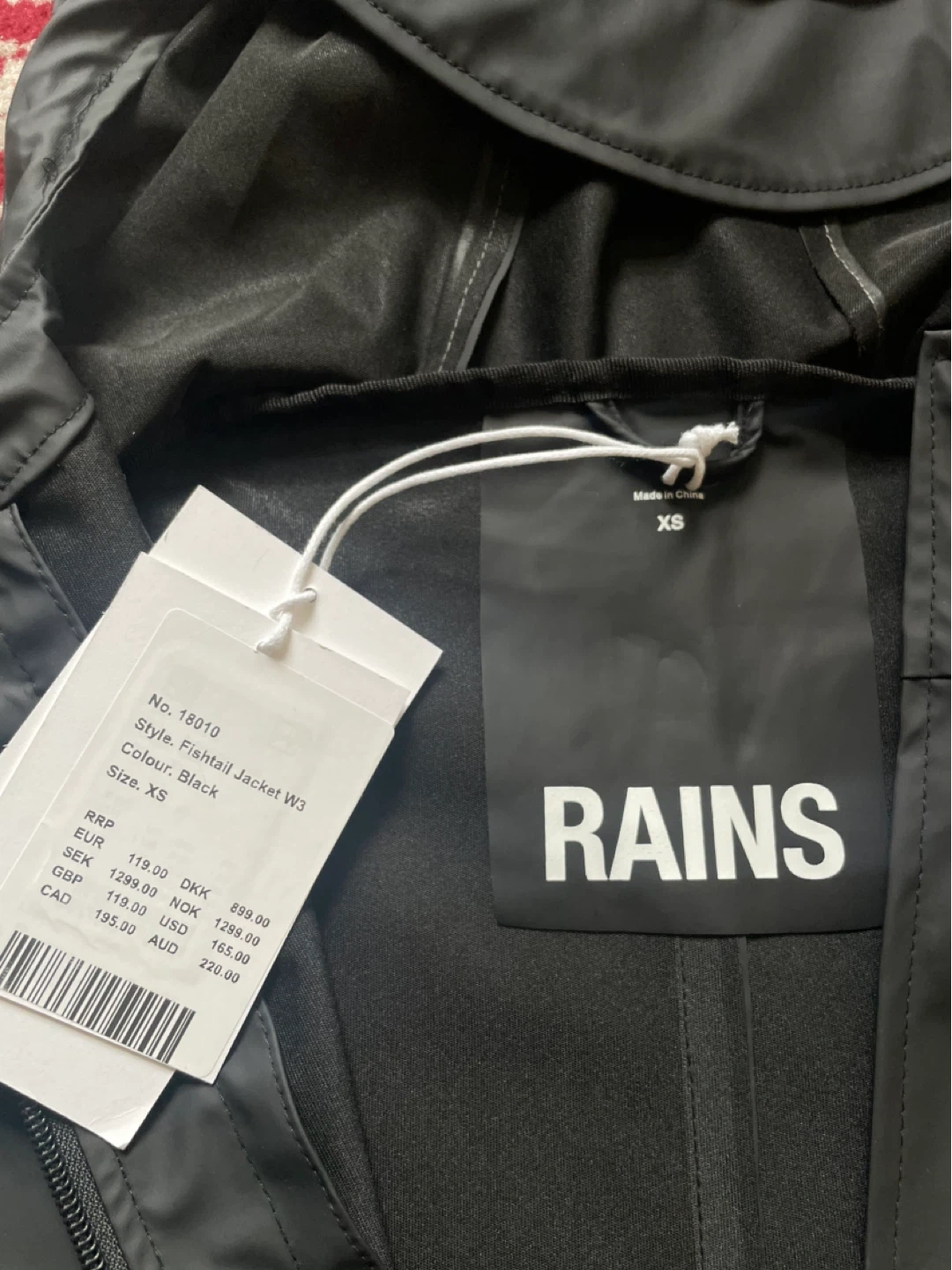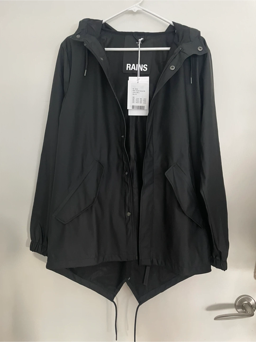 Selling a brand new Rains Fishtail Jacket W3 in black, size XS! This stylish jacket is perfect for rainy days. It's in great condition and ready for a new home! The jacket features a hood and a unique fishtail design.