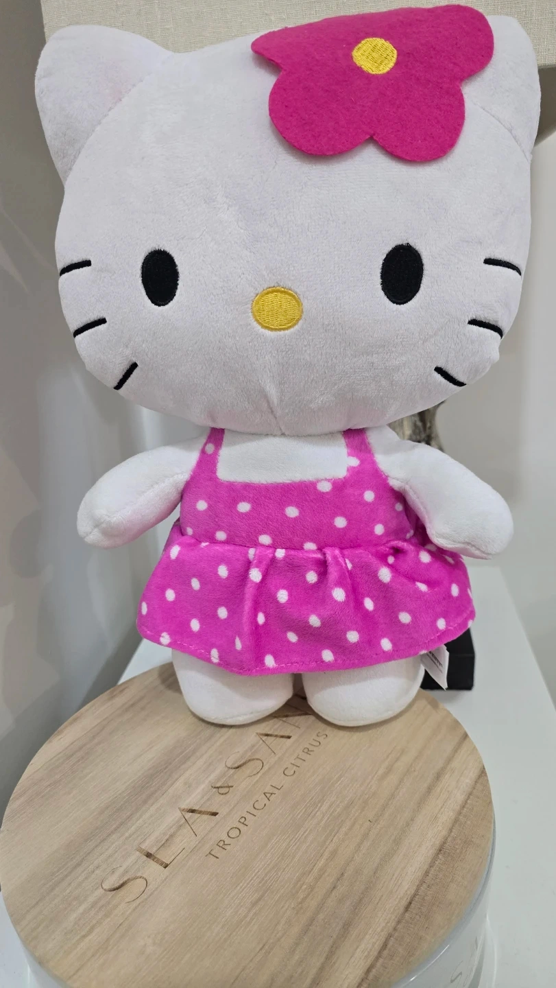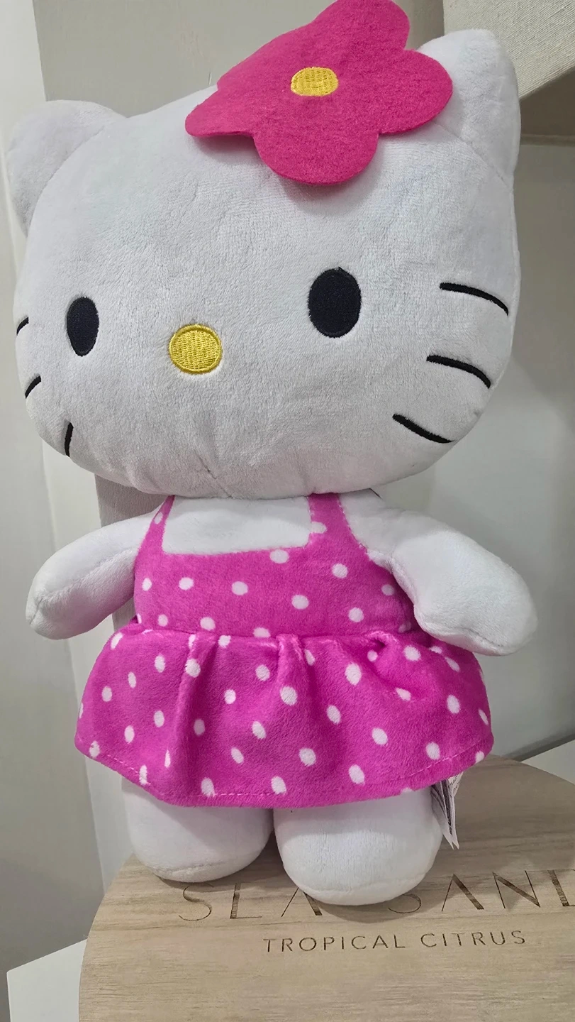 Cute Hello Kitty in excellent condition! It features a pink dress with white polka dots and a pink flower on its head. Perfect for any Hello Kitty fan