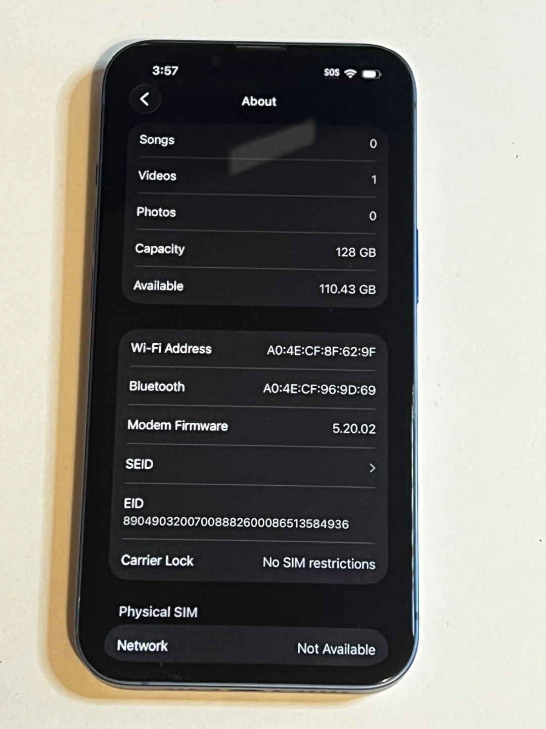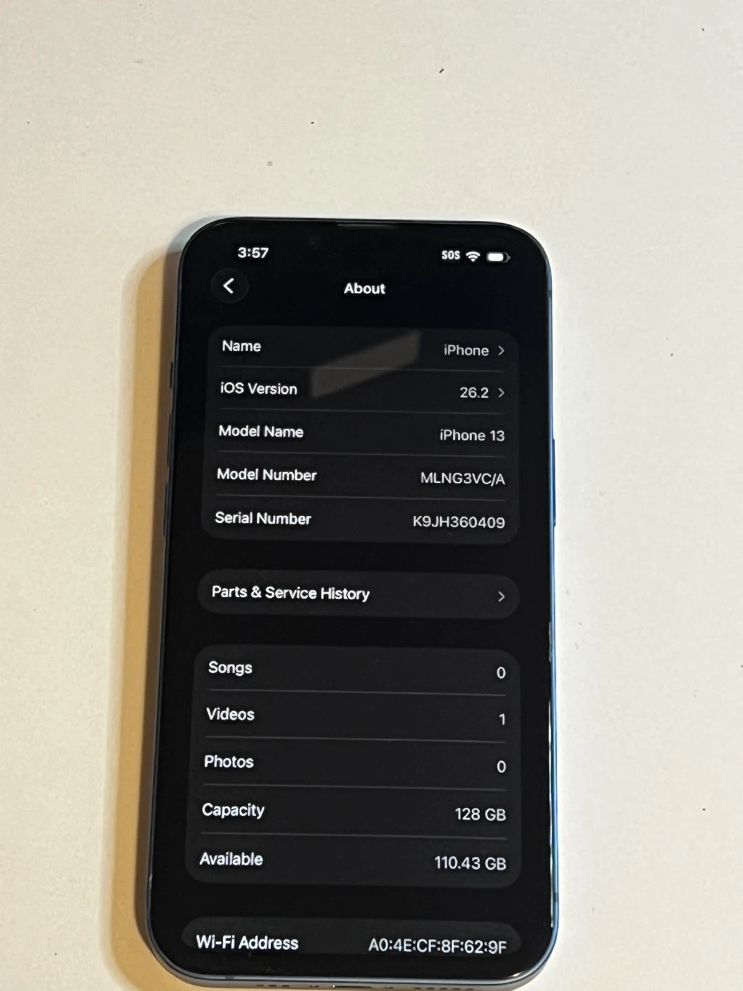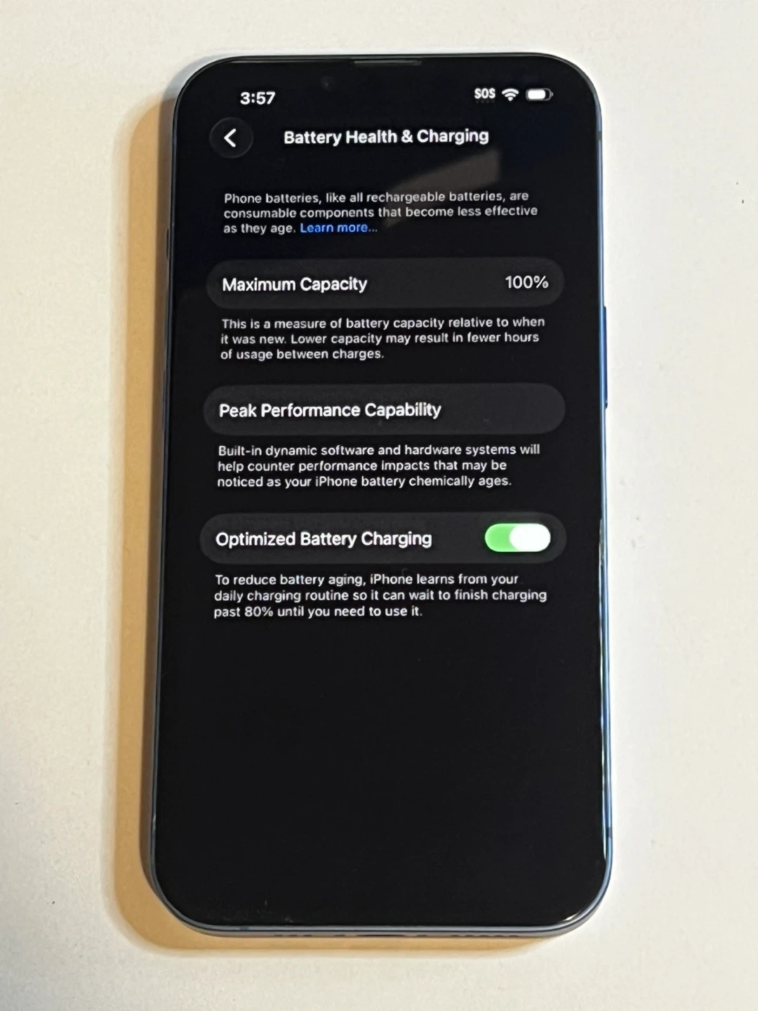 This is an Apple iPhone 13 with 128GB storage. The battery capacity is at 100% with peak performance capability. It's unlocked with no SIM restrictions.