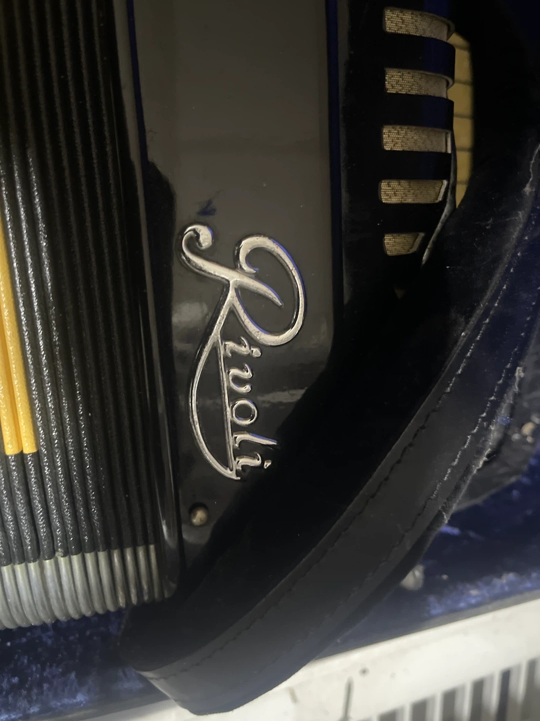This is a Rivoli accordion, made by Sonola. It's black with a yellow design detail and comes with straps. The accordion is housed in a velvet-lined case. An excellent instrument for musicians!