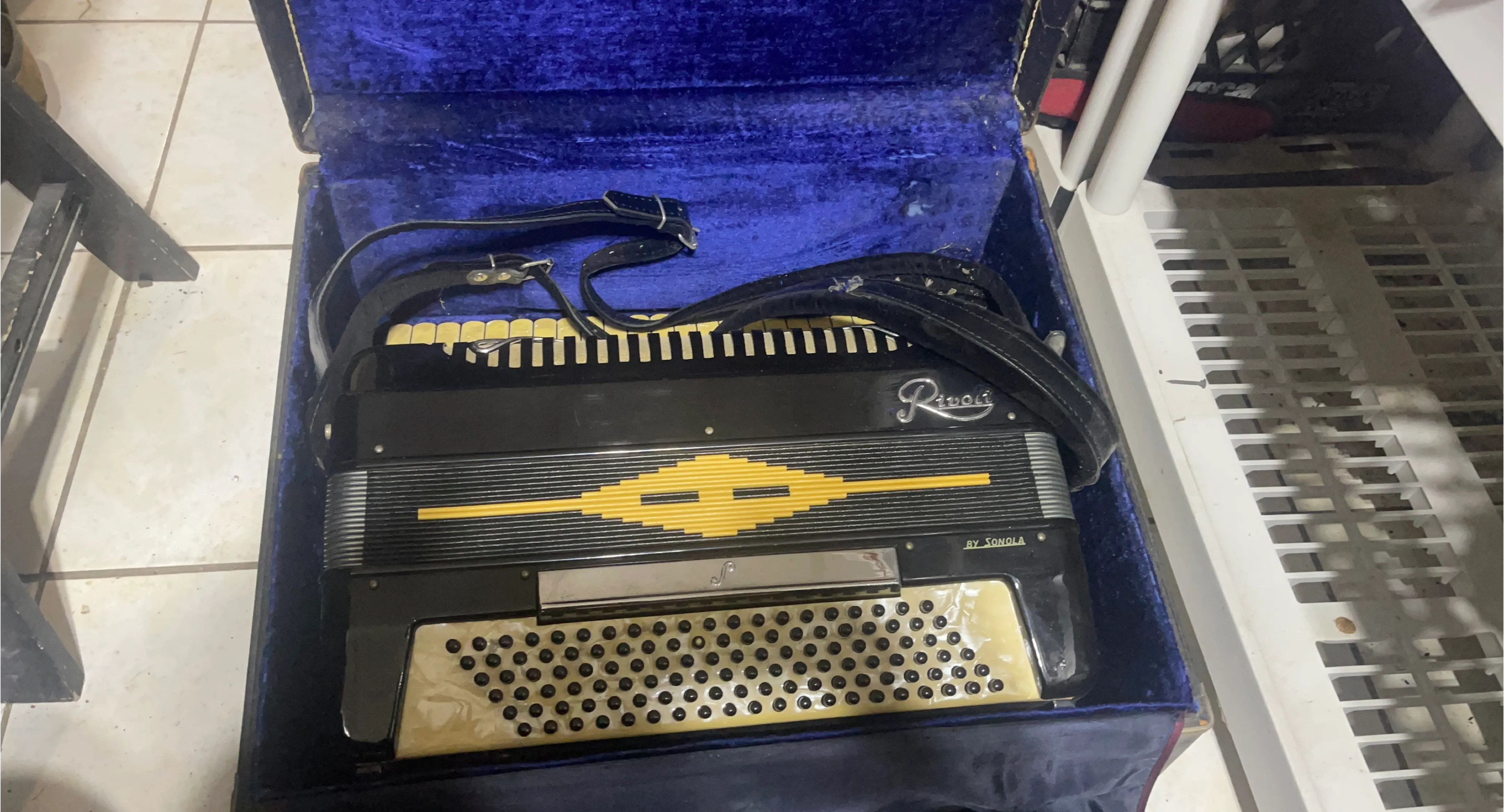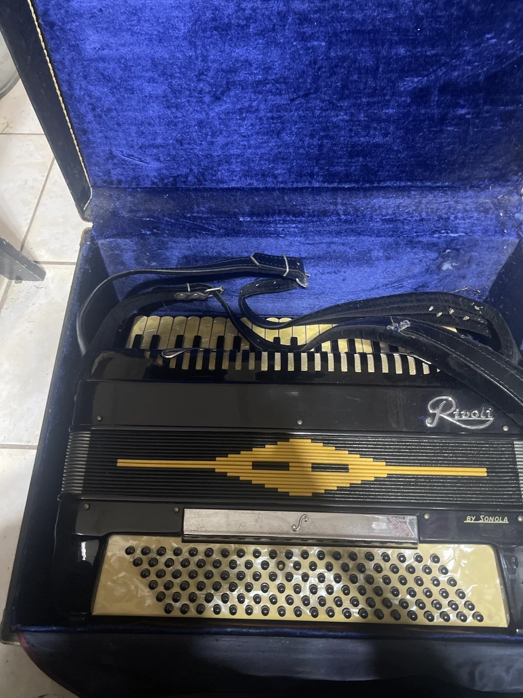 This is a Rivoli accordion, made by Sonola. It's black with a yellow design detail and comes with straps. The accordion is housed in a velvet-lined case. An excellent instrument for musicians!