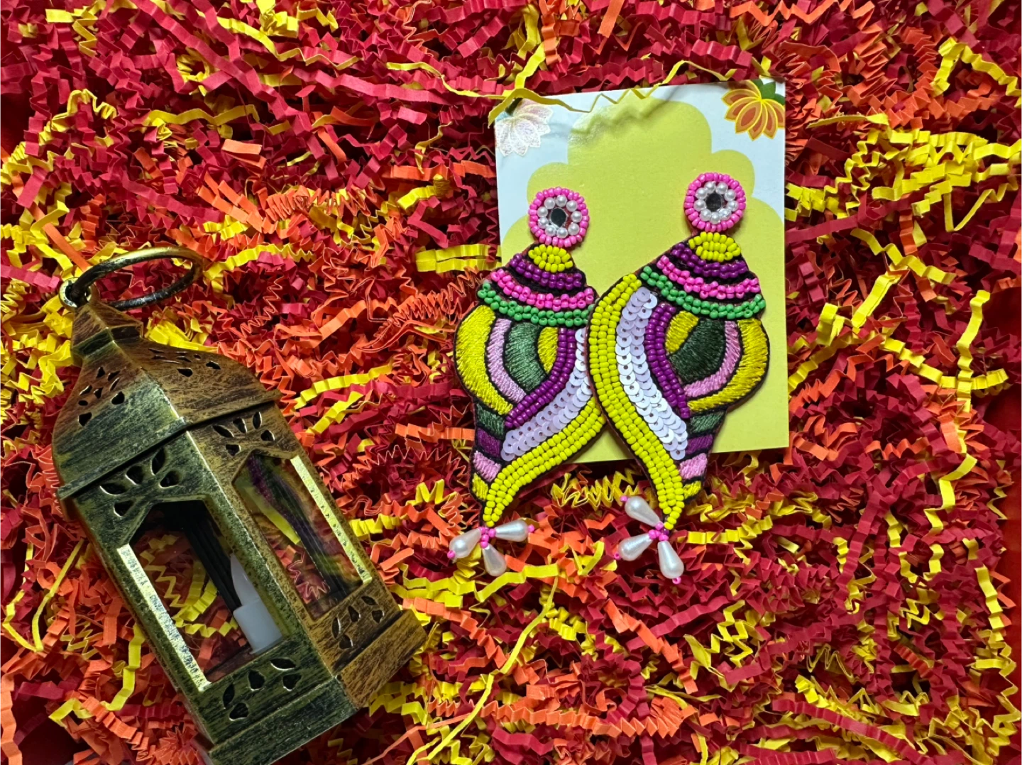 These are some fun, colourful handmade beaded earrings! They're perfect for adding a pop of colour to any outfit. The earrings feature intricate beadwork in shades of yellow, green, pink, and purple, with delicate pearl accents. They're lightweight and comfortable to wear, making them ideal for all day events wear !