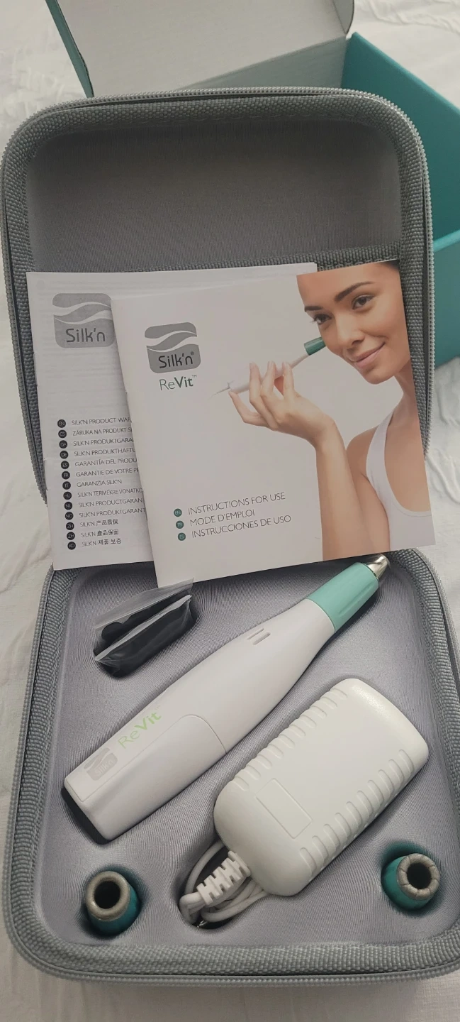 This Silk'n Revit is a microdermabrasion device designed for at-home use. It comes with its original case and instructions. It includes the device, charging base, and extra tips. It's great for skin rejuvenation!
