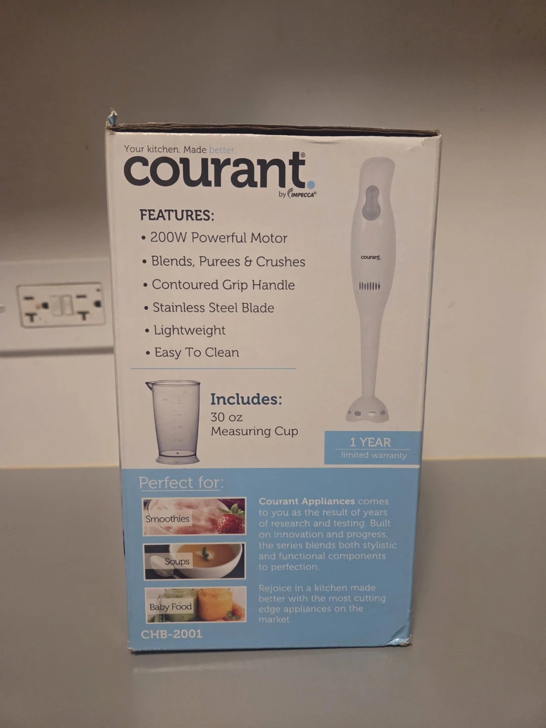 This is a 2 speed hand blender with a 200W powerful motor. It features a stainless steel blade and comes with a 30 oz measuring cup. It's lightweight and easy to clean!