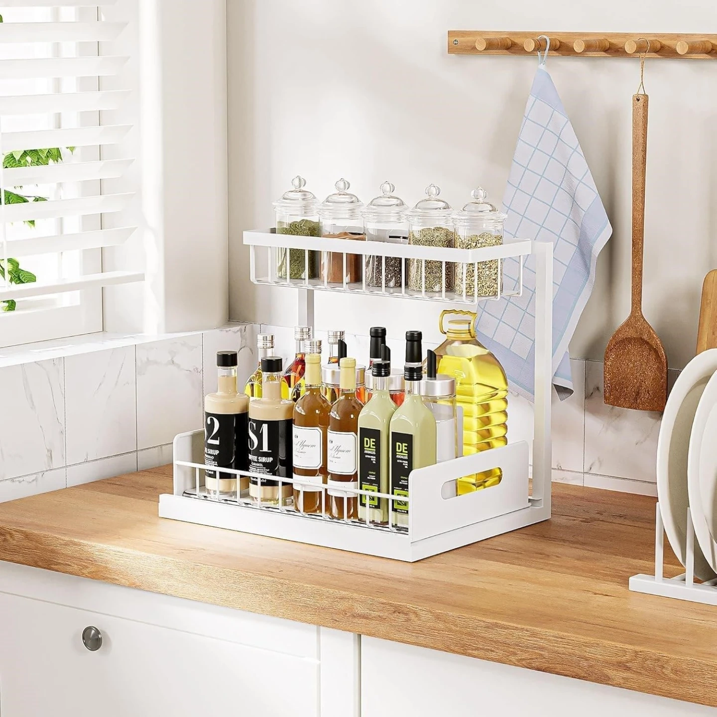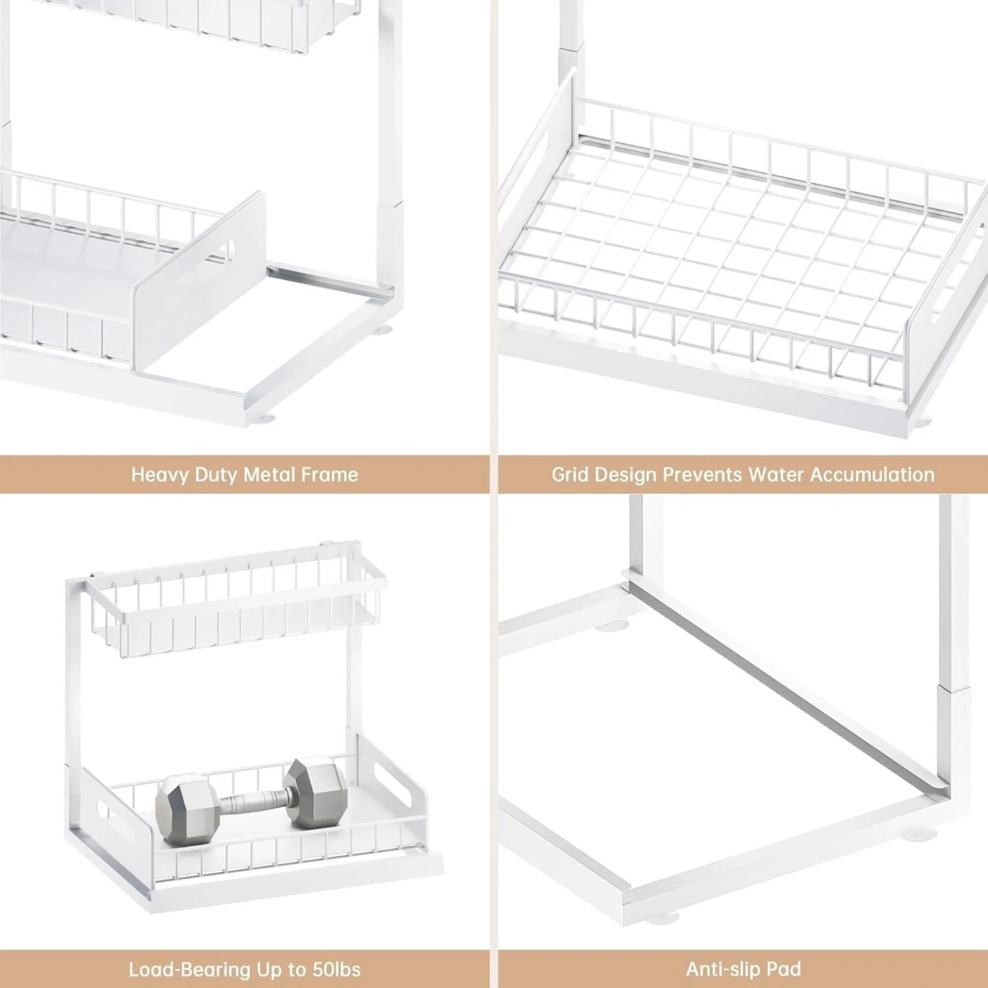 This two-tier sliding cabinet organizer is made of a heavy-duty metal frame and features a grid design that prevents water accumulation. It's perfect for storing bottles and jars under the sink or in kitchen cabinets. The slide-out design and strong load-bearing capacity make it a practical storage solution!