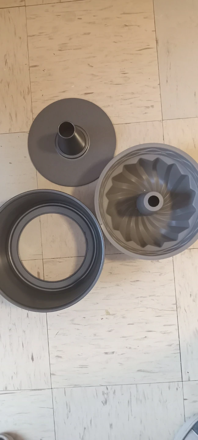 This is a set of Bundt cake pans. It includes a fluted silicone pan with a tube in the centre, one ring pan, one base. They're great for making decorative cakes!
