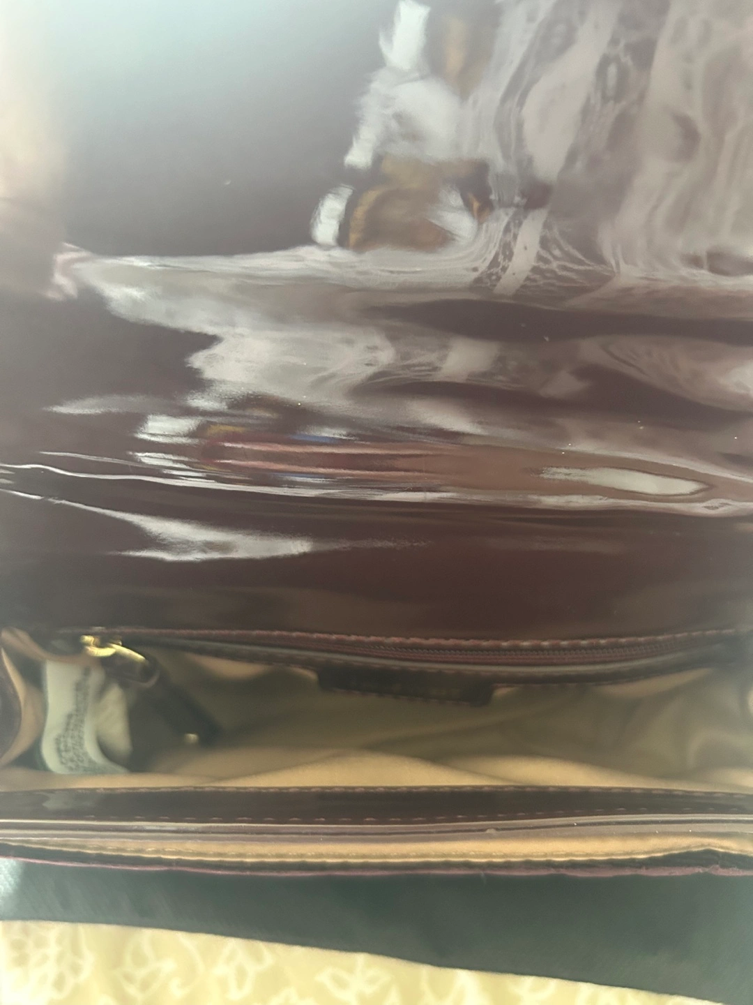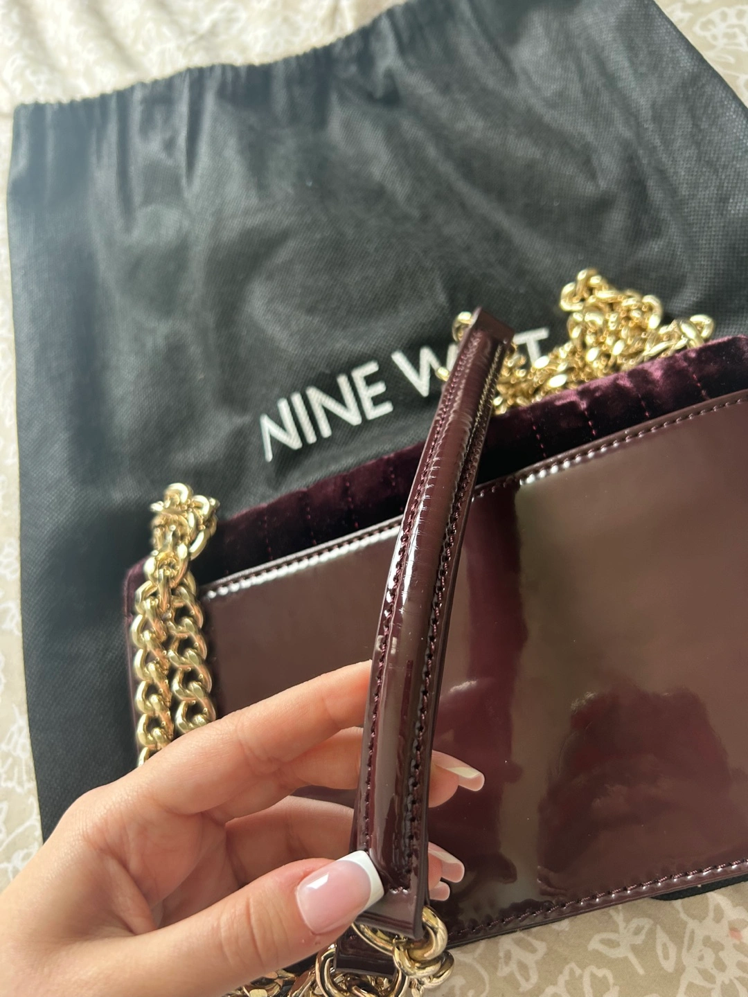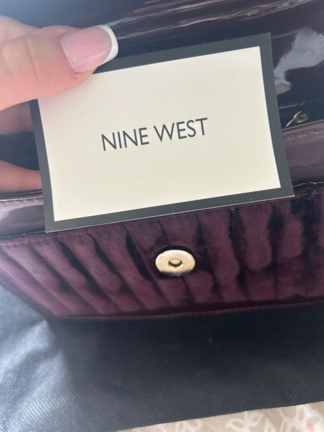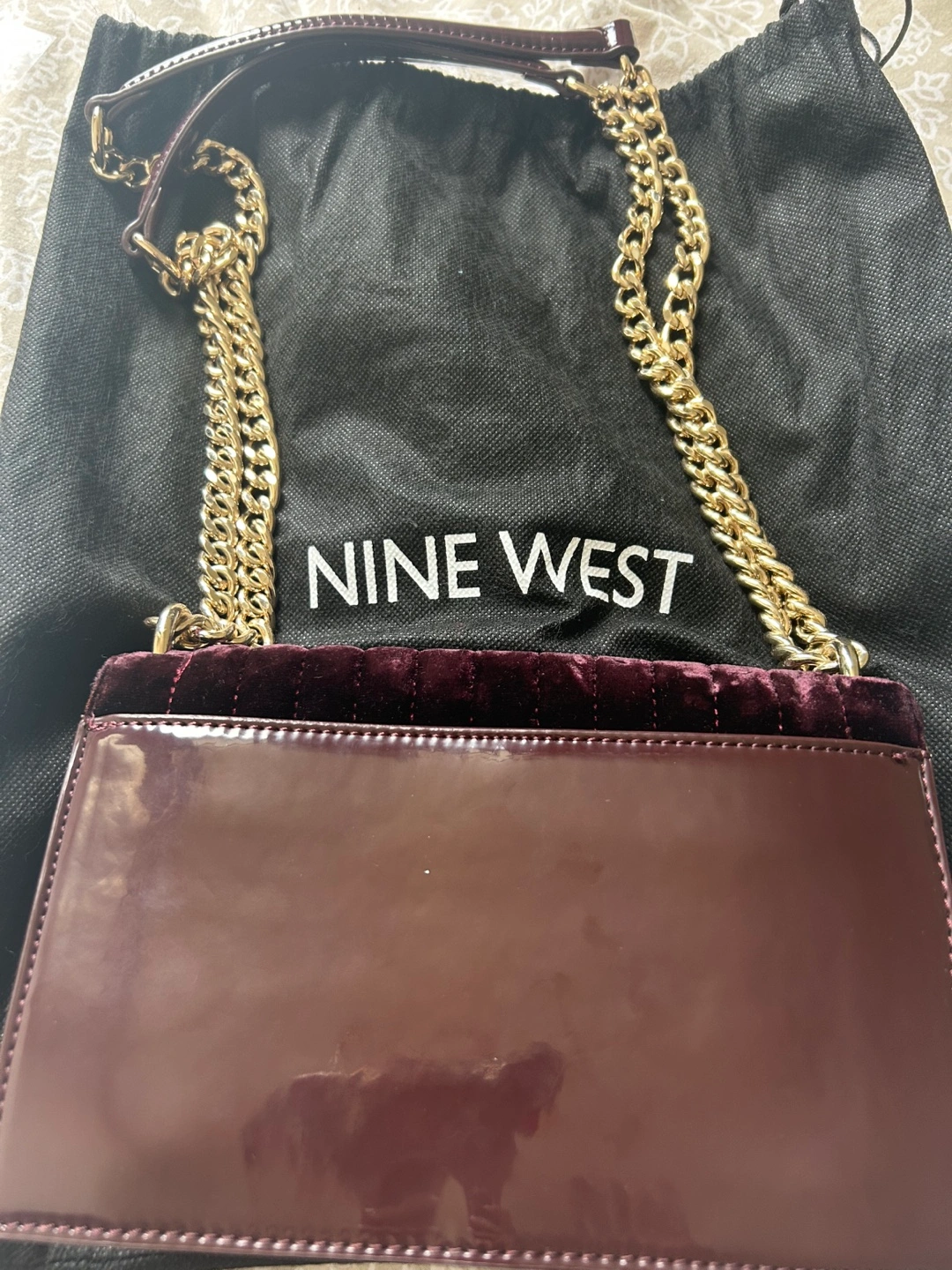 This is a beautiful Nine West bag that has been discontinued! It features a gold toned two-chain shoulder strap that can be converted into a cross body. It also has a mix of materials like velvet at the front of the bag and faux-patent leather on the boarders and back of the bag. Inside of the bag is clean with no markings! Dust bag is included!