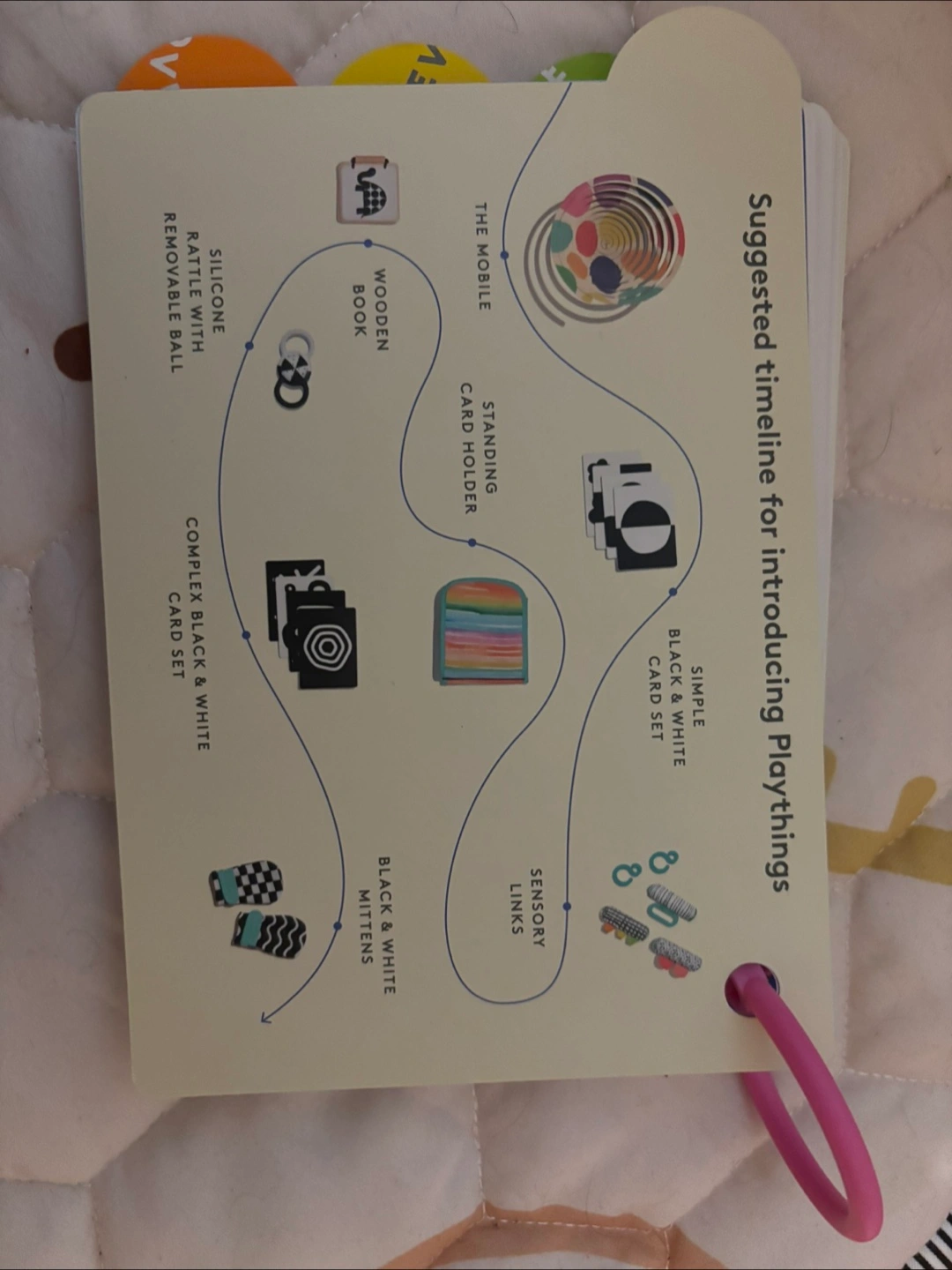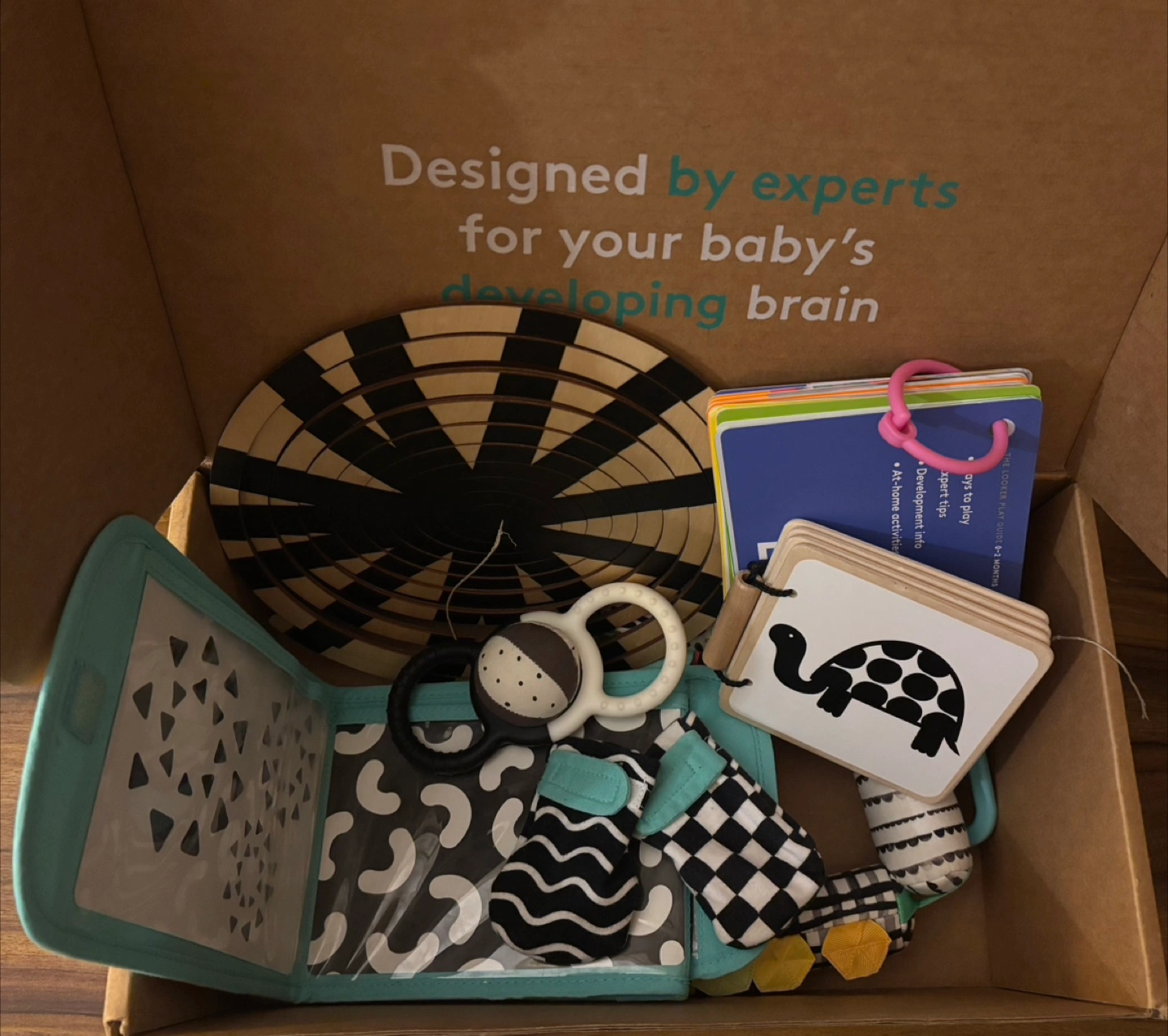 It includes various playthings like a wooden book, silicone rattle with a removable ball, sensory links, black and white mittens, and complex black & white card set. box not included