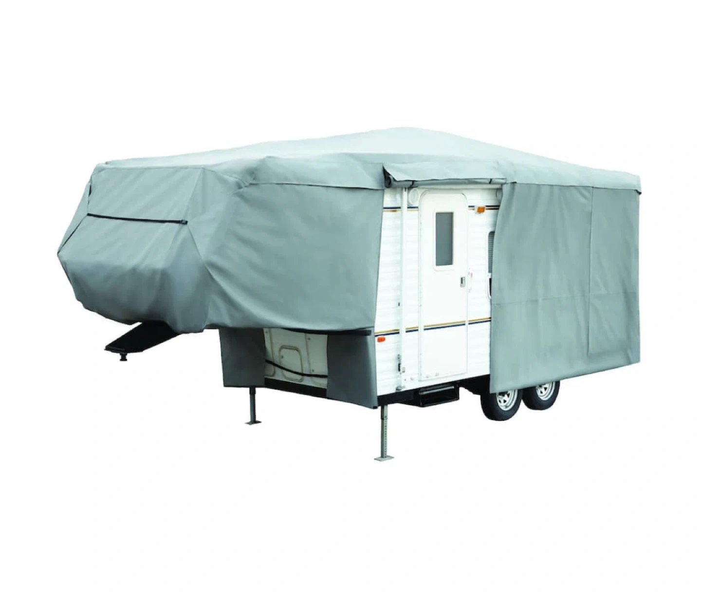 Fit: Universal fit for 26-29 ft 5th wheels, with elastic hems, tie-downs, and buckles for a snug fit.
