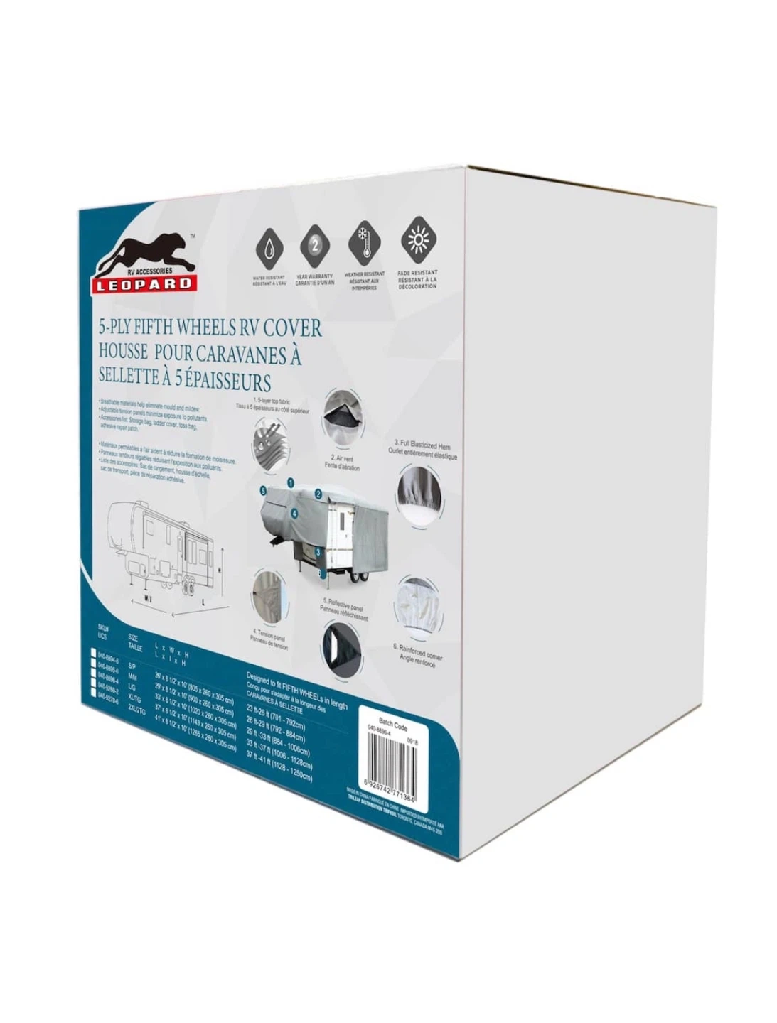 The Leopard Premium 5th Wheel RV cover for 26-29 ft models offers heavy-duty, 5-layer protection with breathability, air vents, and water/UV resistance, featuring buckles and straps for a secure, universal fit, often including accessories like a storage bag and ladder cover, perfect for year-round outdoor storage to protect against mildew, sun, and weather.