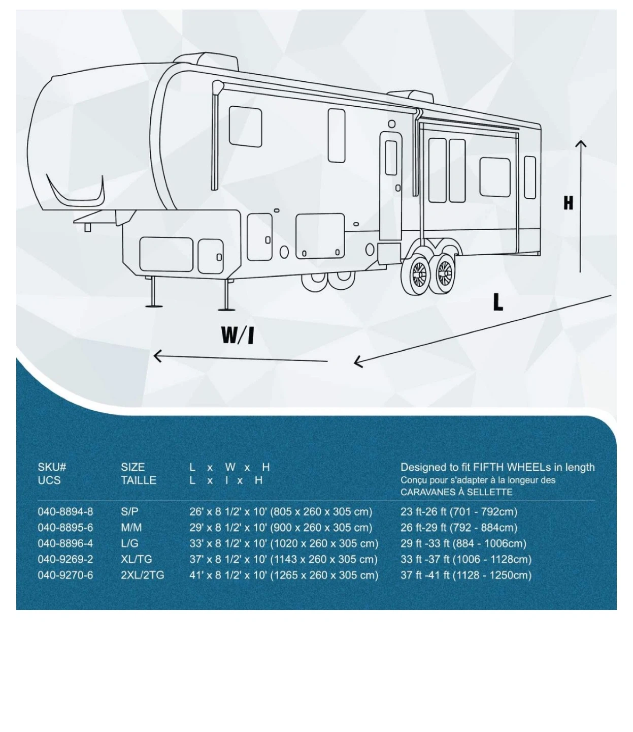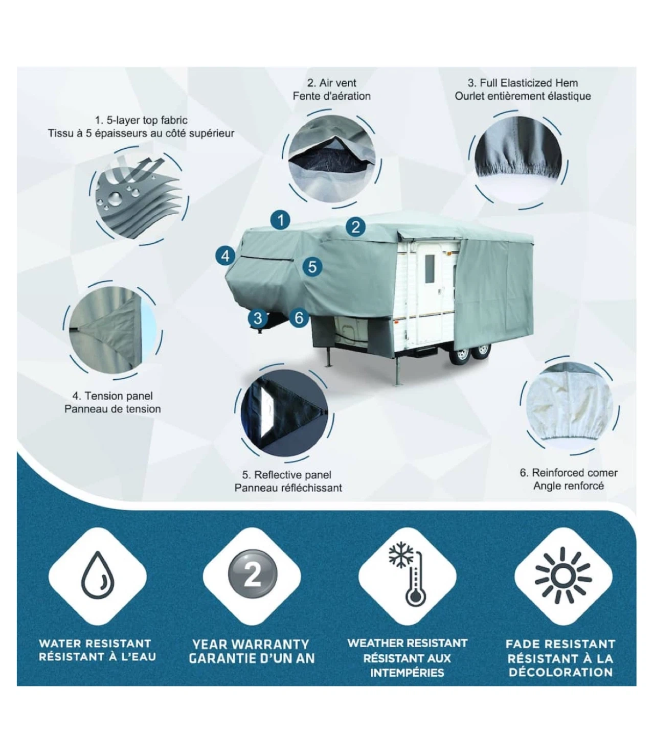 Fit: Universal fit for 26-29 ft 5th wheels, with elastic hems, tie-downs, and buckles for a snug fit.