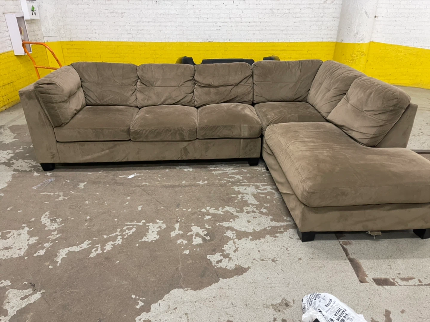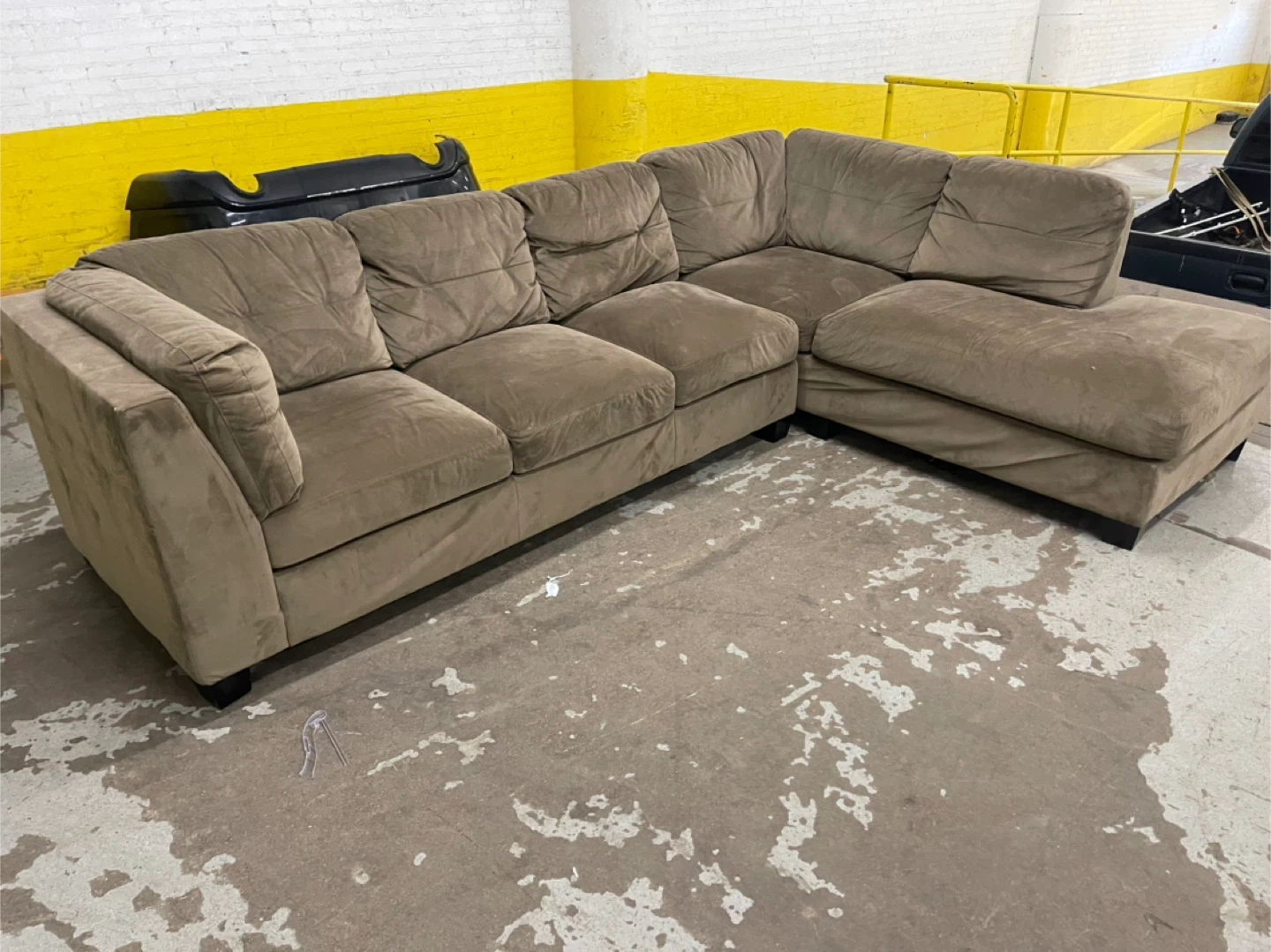 Comfortable taupe sectional sofa with a chaise lounge. Its plush cushions and tufted back offer a cozy seating experience. Fabric material.