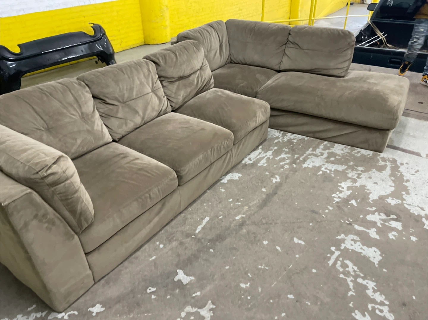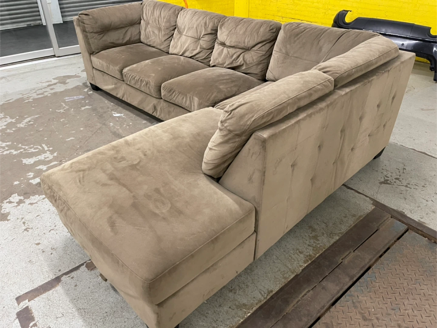 Comfortable taupe sectional sofa with a chaise lounge. Its plush cushions and tufted back offer a cozy seating experience. Fabric material.