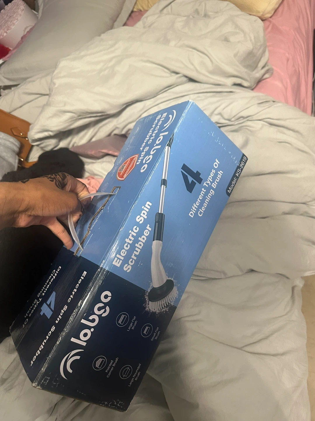 This electric spin scrubber comes with 4 different types of cleaning brushes. It features an extendable handle for reaching different areas. It's great for tackling tough cleaning jobs around the house!