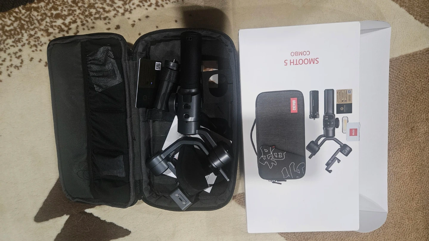This is a Zhiyun Smooth 5 Combo gimbal. It's designed for smartphone videography. Includes original box and carrying case.