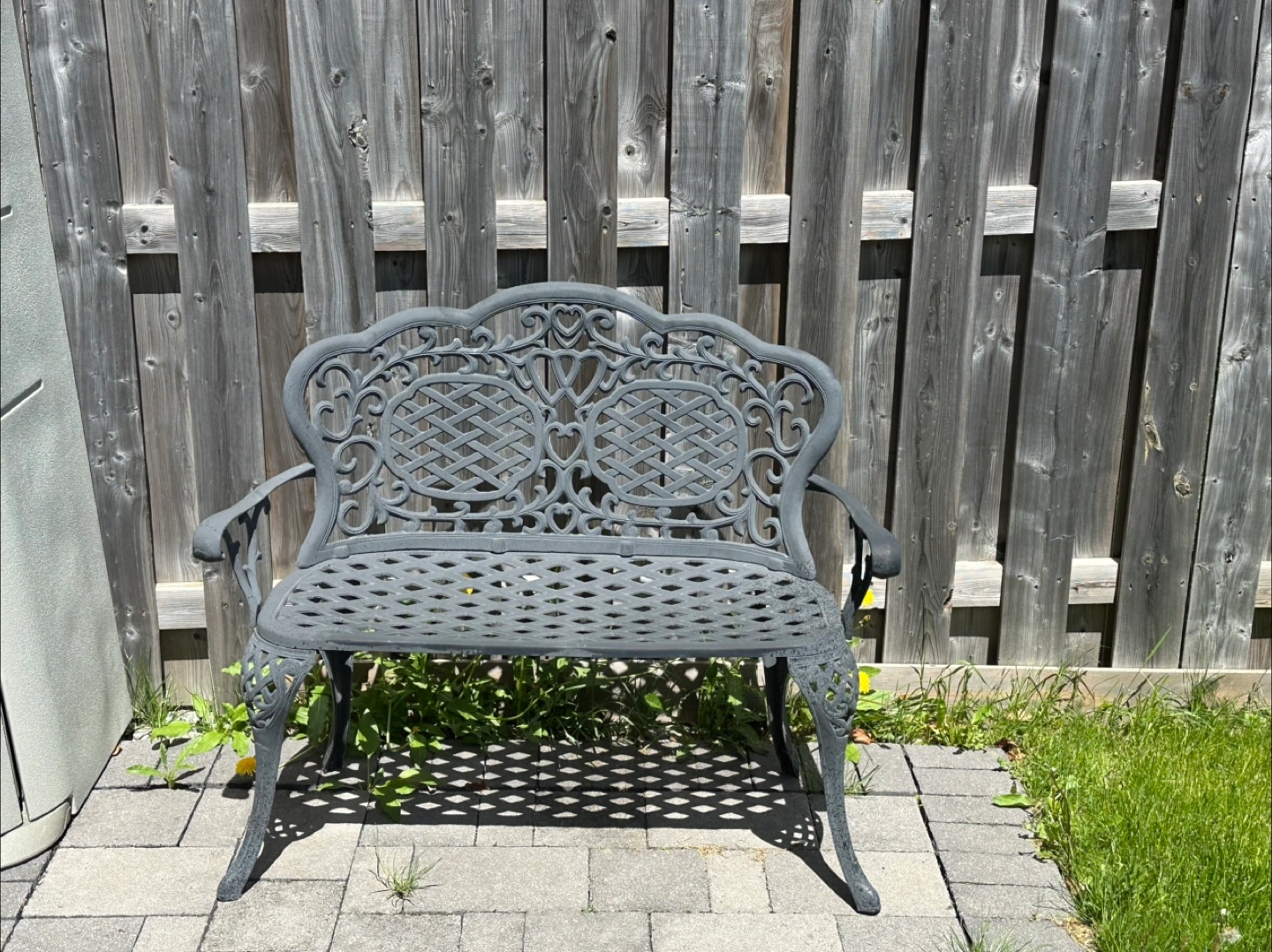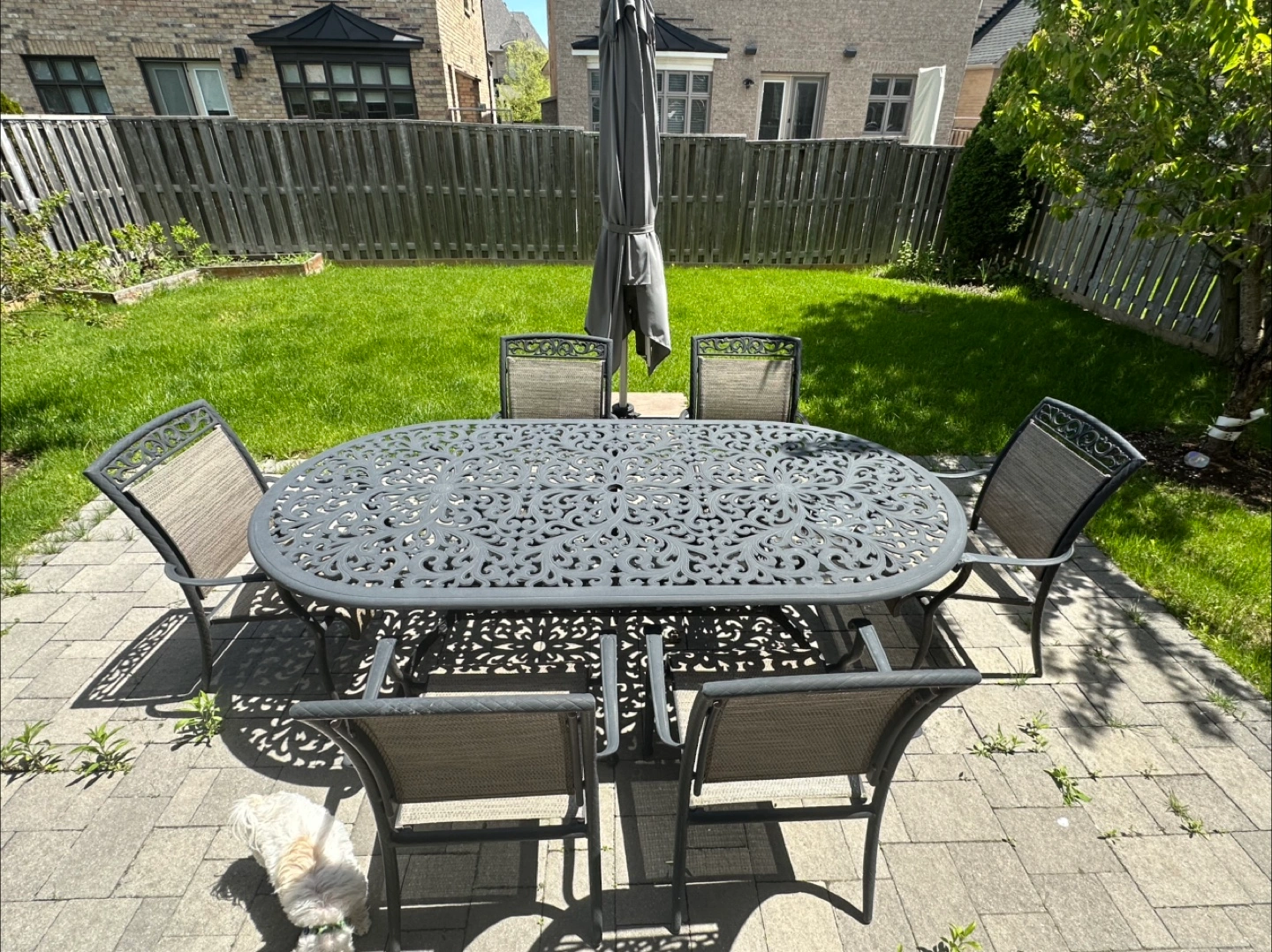 Seven-piece outdoor patio set. Includes oval table and six chairs. Durable metal construction. Intricate detailing. Excellent for entertaining.