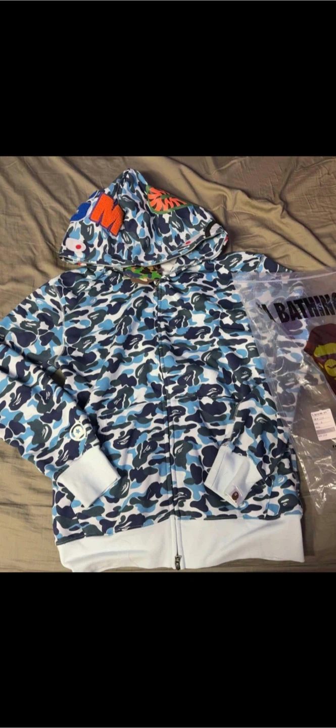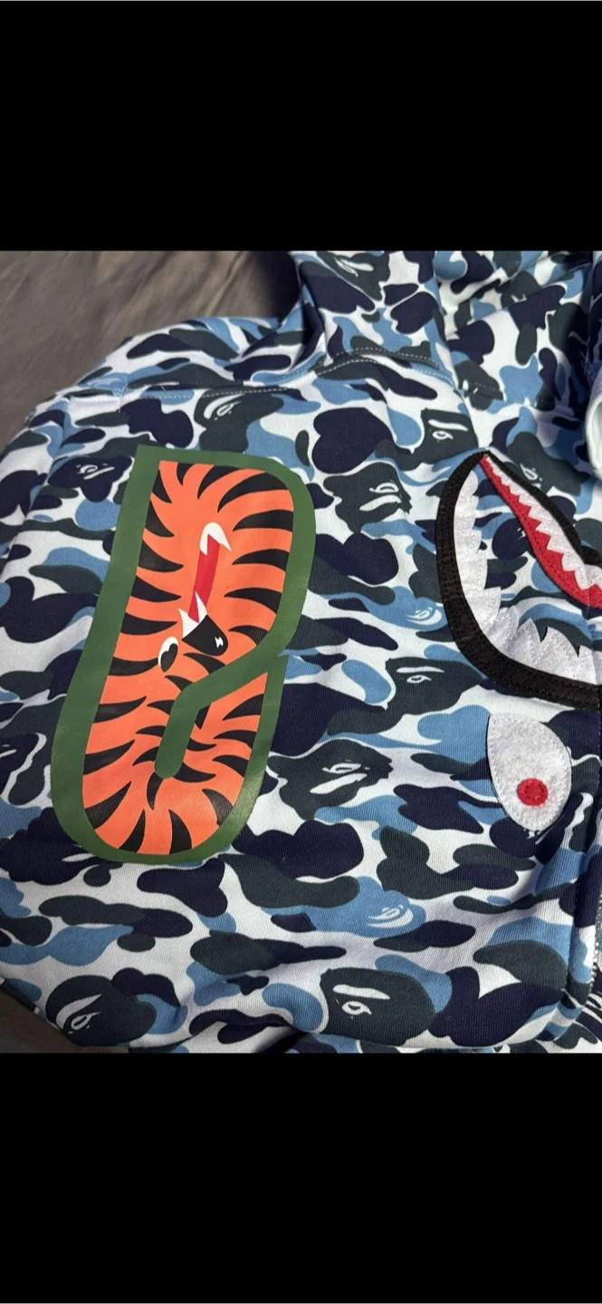 Classic BAPE Shark full zip hoodie in the blue camouflage pattern. Features the iconic shark face on the hood and embroidered patches on the chest. Ribbed cuffs and hem. Comes with original packaging.
