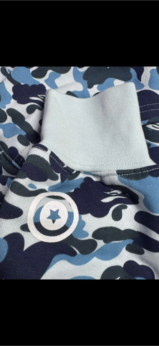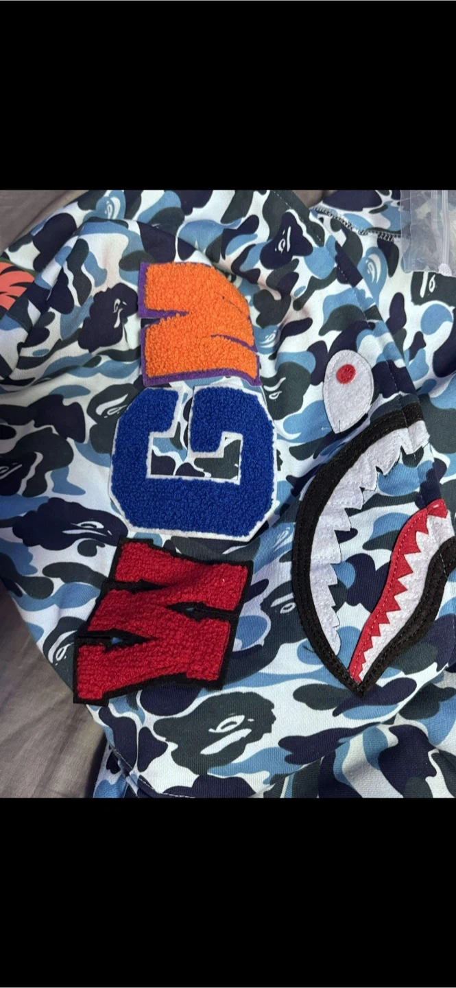 Classic BAPE Shark full zip hoodie in the blue camouflage pattern. Features the iconic shark face on the hood and embroidered patches on the chest. Ribbed cuffs and hem. Comes with original packaging.