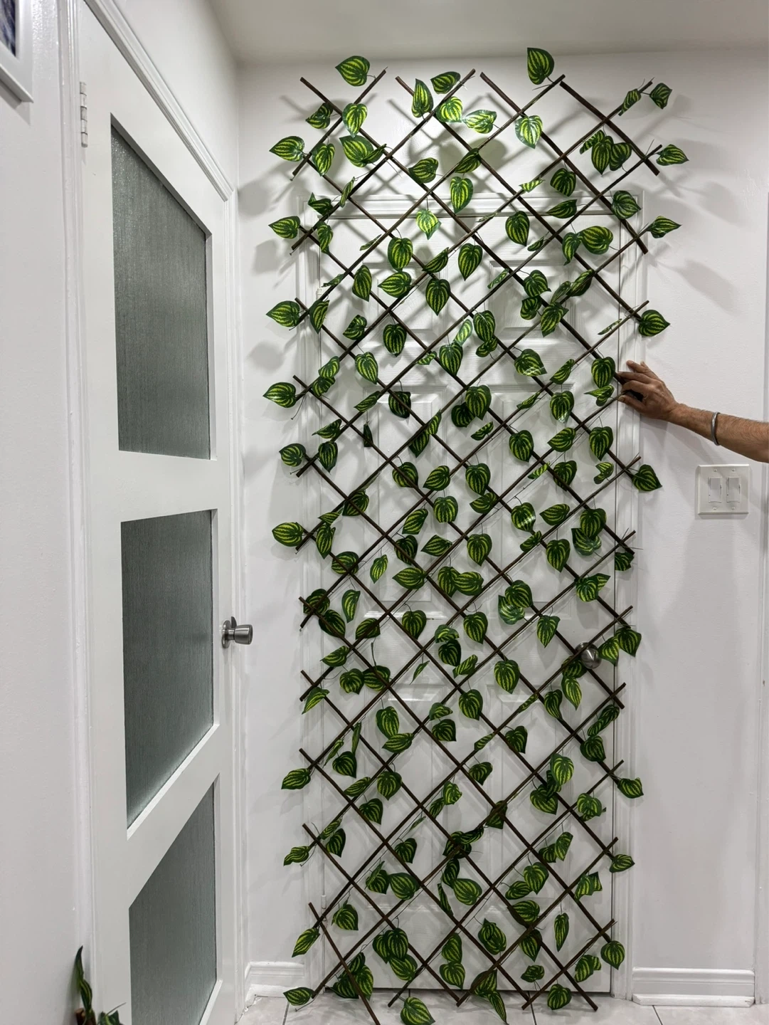 This expandable garden trellis is covered in realistic artificial ivy leaves. It's great for adding privacy or decoration to fences, walls, or balconies. The wooden lattice expands to your desired width and is easy to install.
