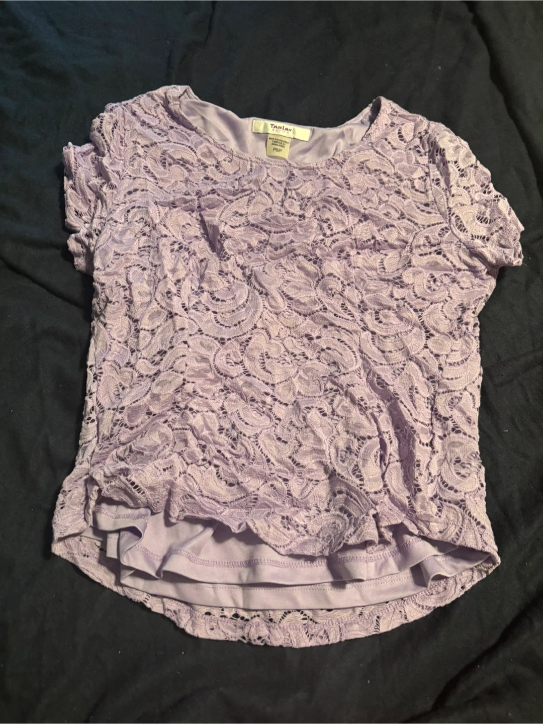 This is a TanJay Petite top in a beautiful lavender colour. It features a delicate lace pattern and is a size PS/P.