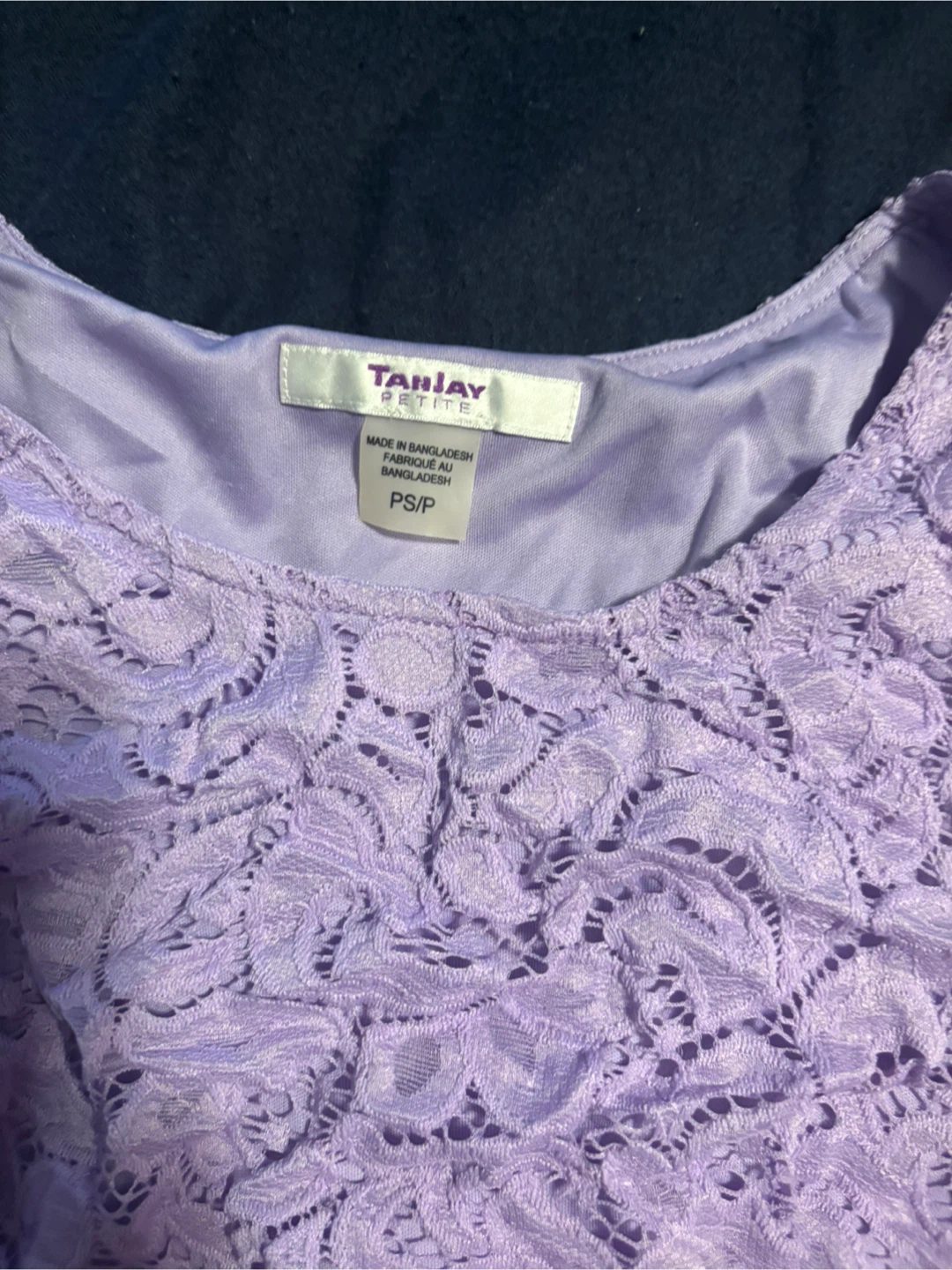 This is a TanJay Petite top in a beautiful lavender colour. It features a delicate lace pattern and is a size PS/P.