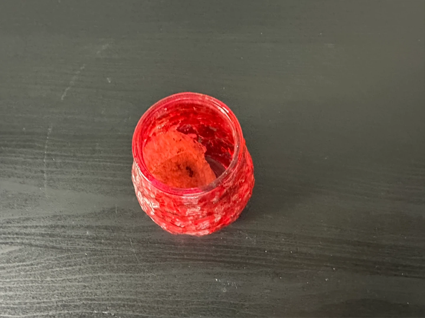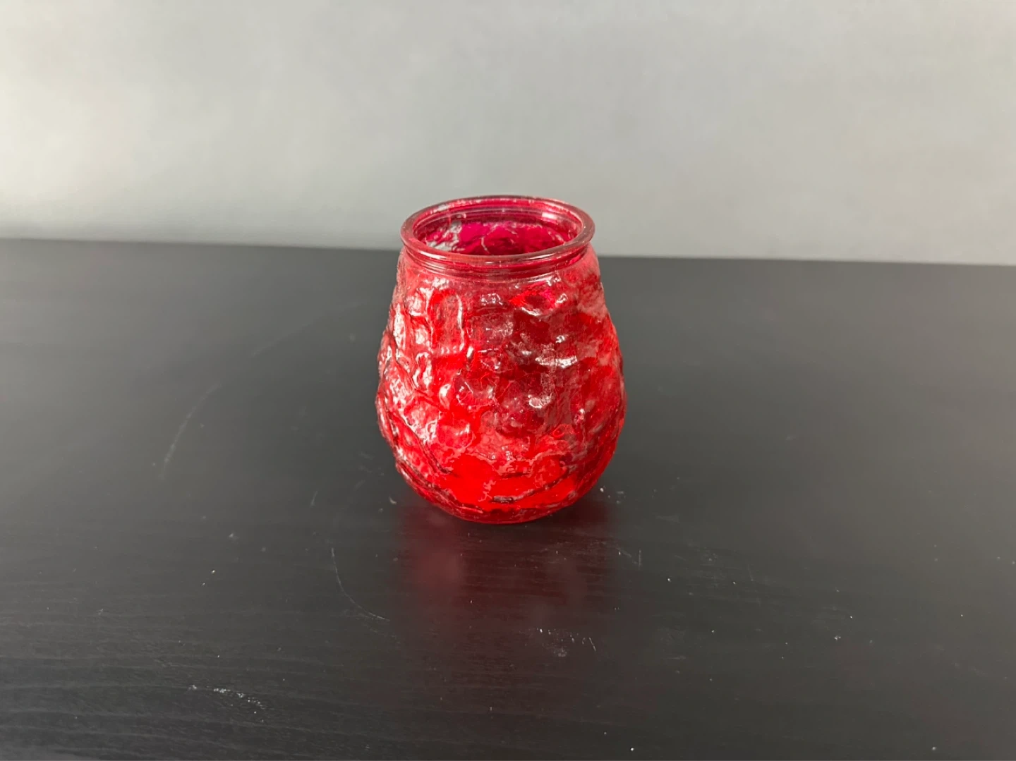 This is a small, red textured glass jar. It's ideal for holding small trinkets or decorative items. The textured glass adds a unique visual appeal.