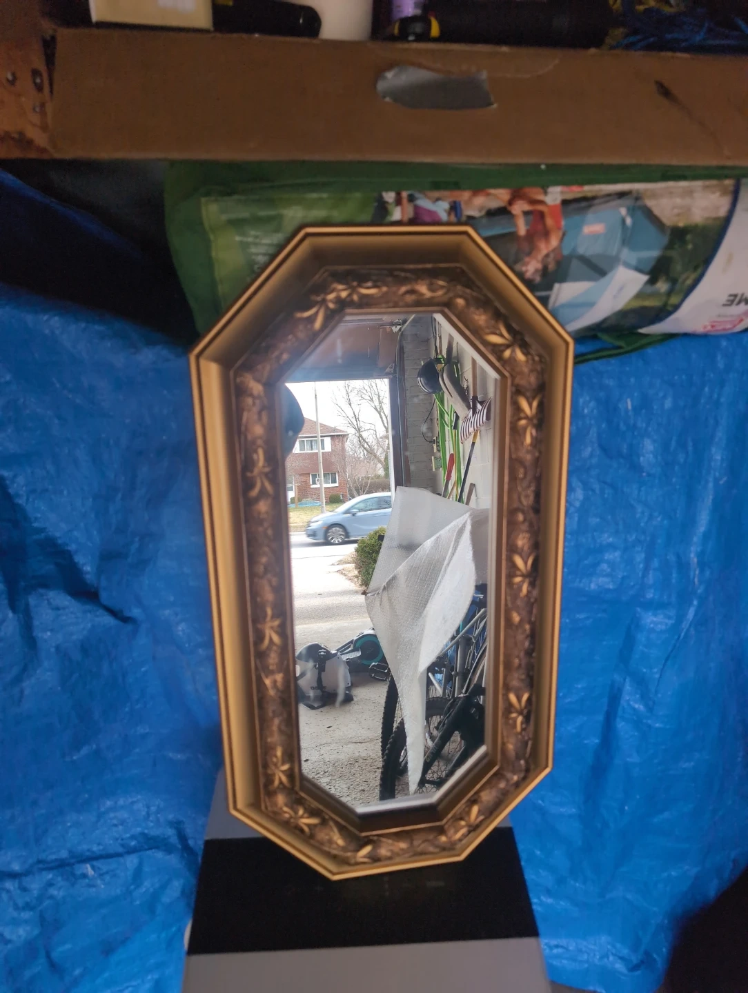 A decorative octagon wall mirror with an ornate gold-toned frame. It's got a classic design perfect for adding a touch of elegance to any room. This mirror is ready to hang!