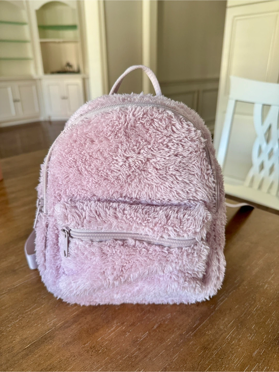 This Uniqlo cute pink fuzzy mini backpack is super soft and plush. It features a zippered main compartment and a front zippered pocket. Perfect for carrying essentials on the go!
