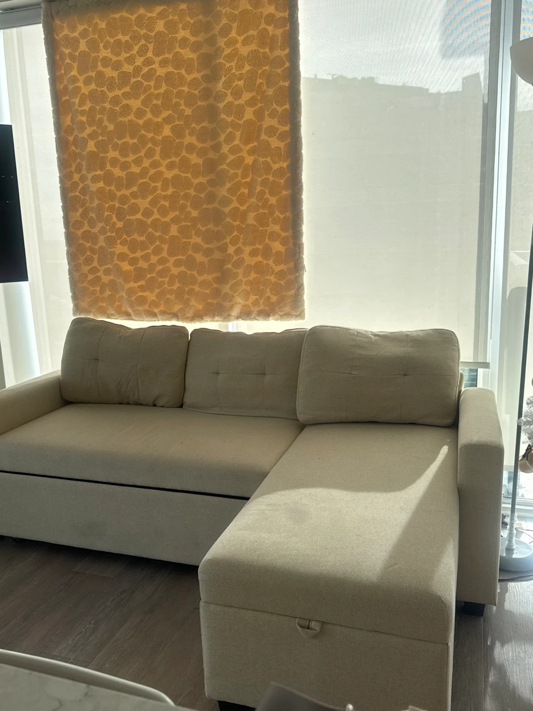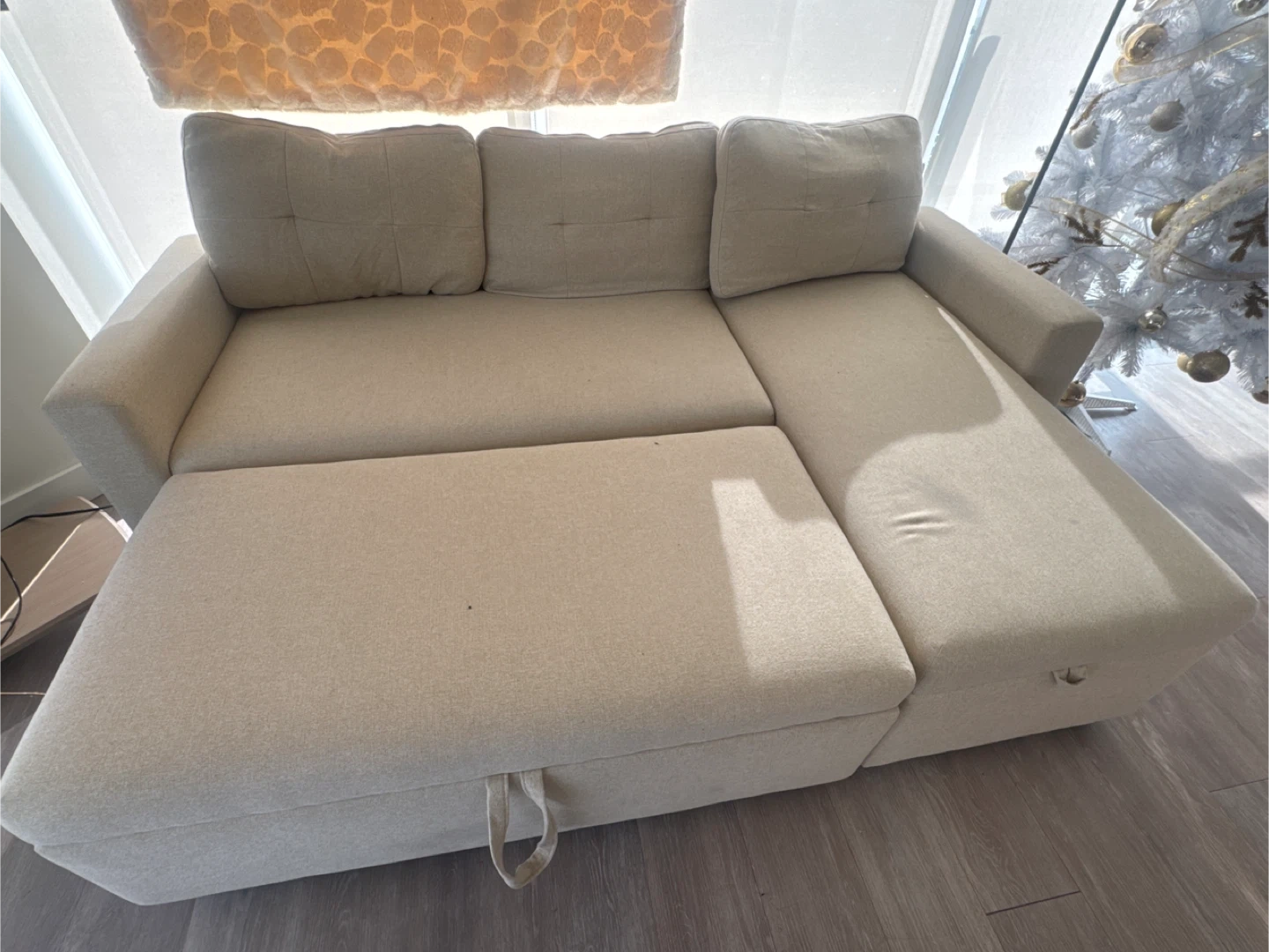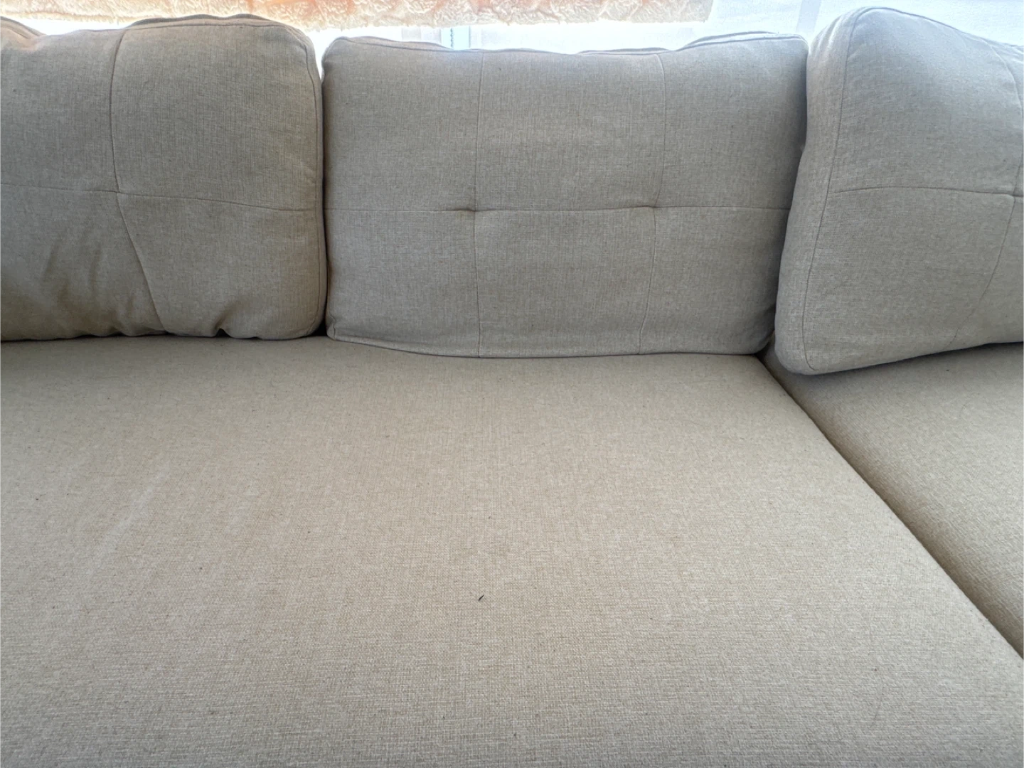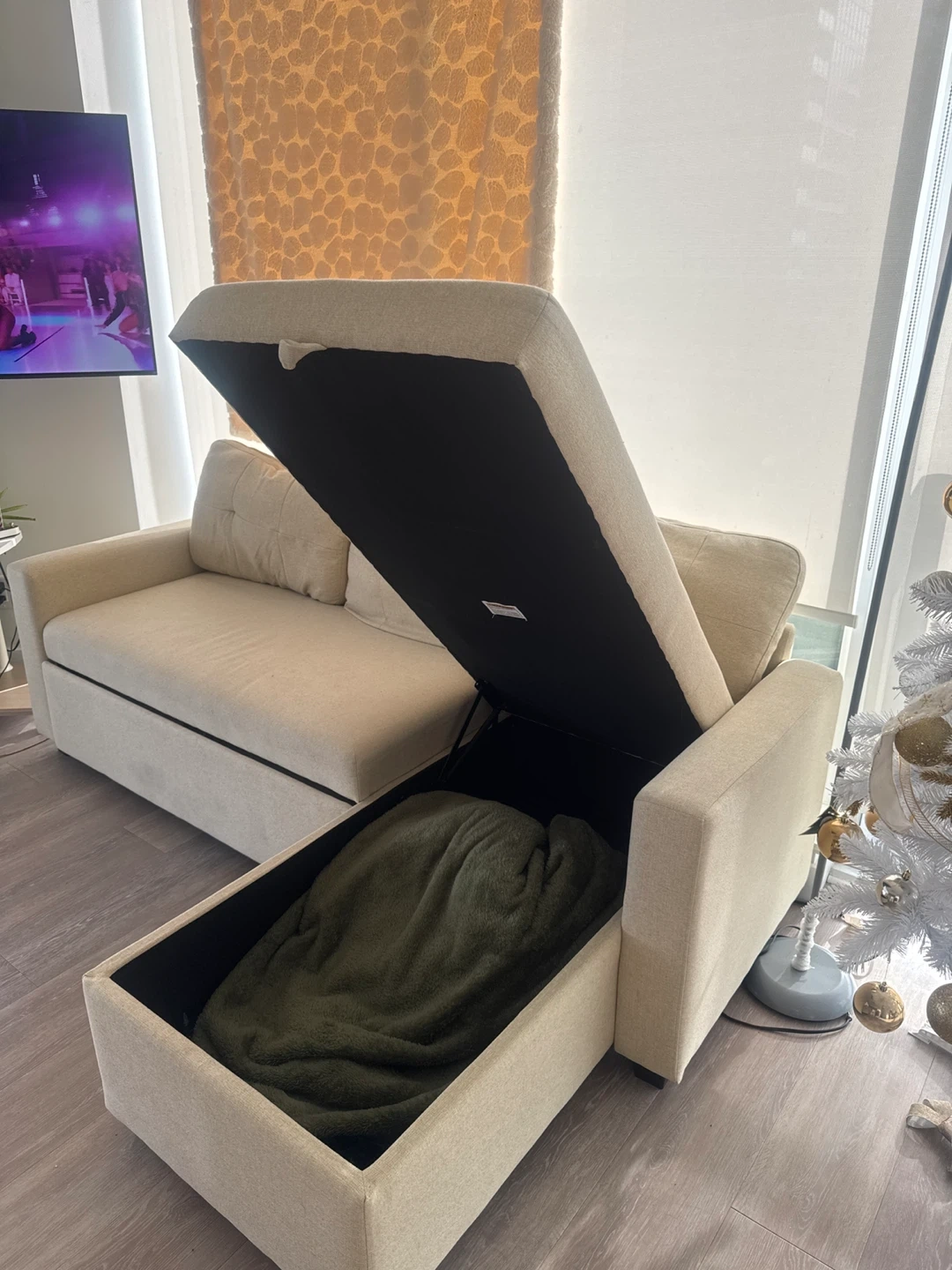This sectional sofa features a chaise with hidden storage. It's upholstered in a durable, neutral-toned fabric. The chaise lifts open for convenient storage space. Perfect for small apartments or maximizing living room utility!