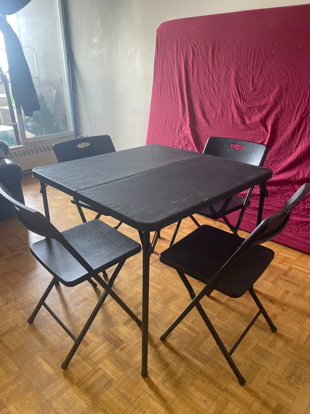 Selling a black plastic folding dining set with 1 table and 4 chairs.