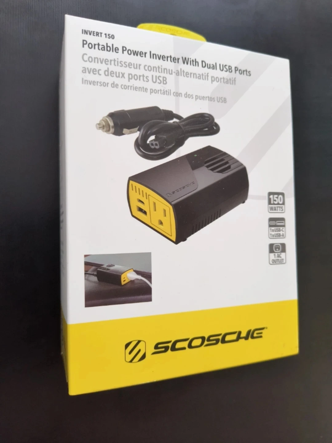 This Scosche portable power inverter converts your car's DC power to AC power. It's rated for 150 watts and includes both USB-C and USB-A ports. It also provides one AC outlet for additional devices. Brand new, never opened in original box.