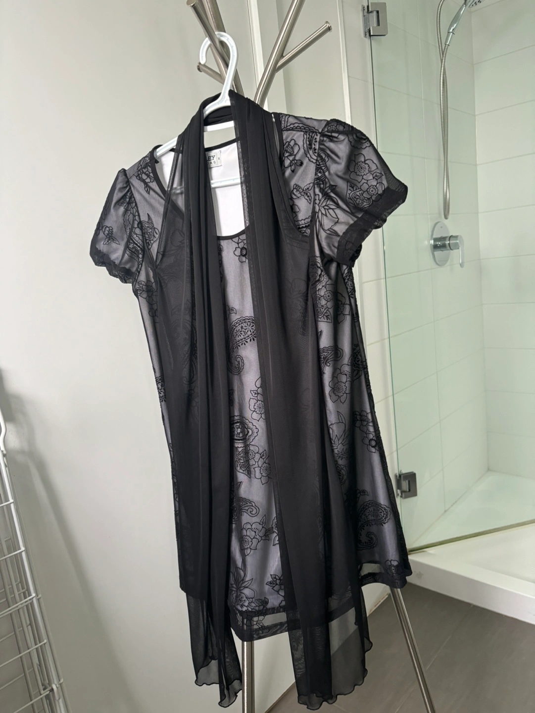 Black mesh dress with floral pattern, includes matching scarf. Short sleeves.