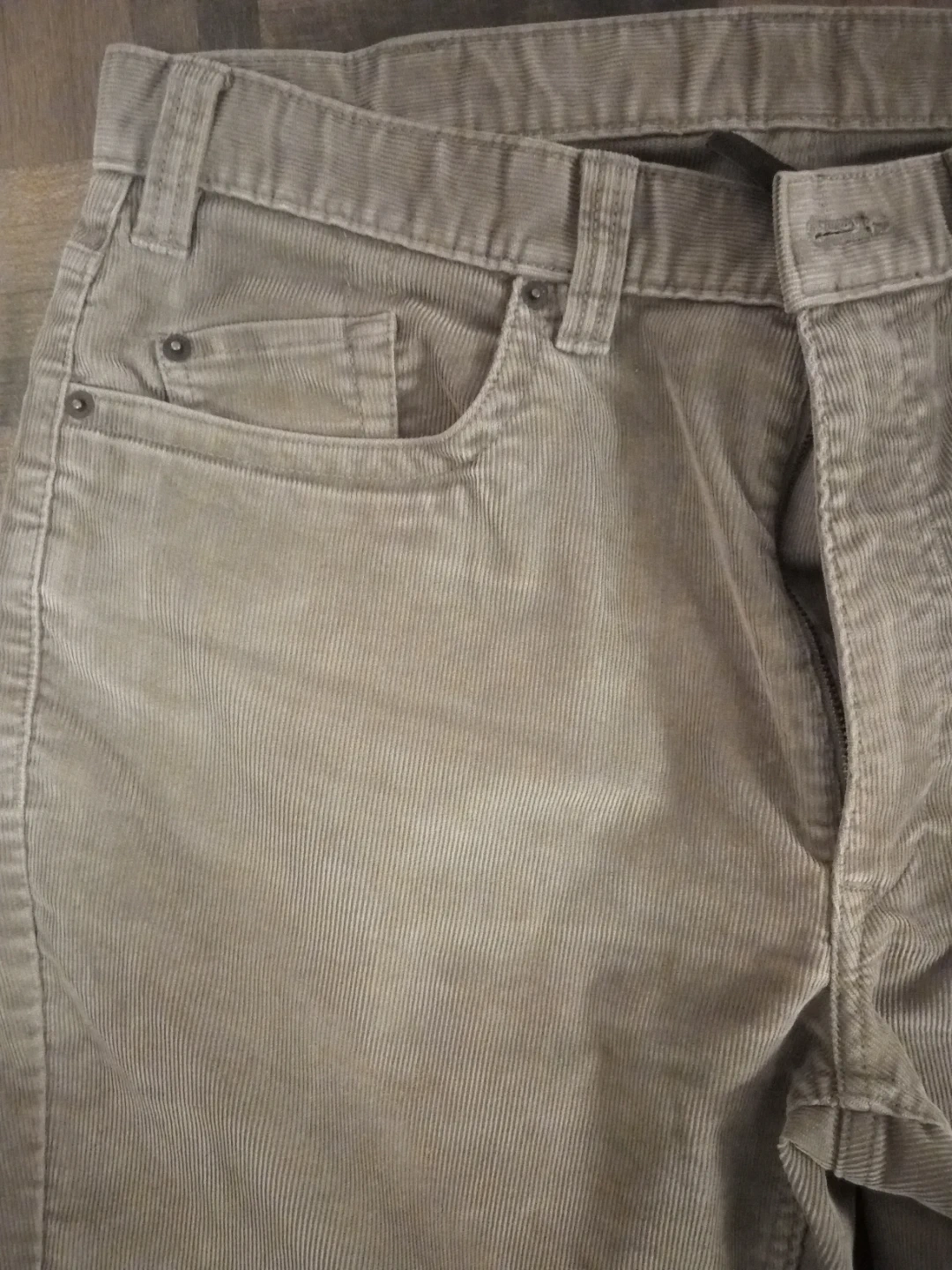 Selling a pair of men's corduroy pants. They are size 36x32 and made of 53% polyester, 45% cotton, and 2% spandex/elastane. These pants were made in Vietnam.