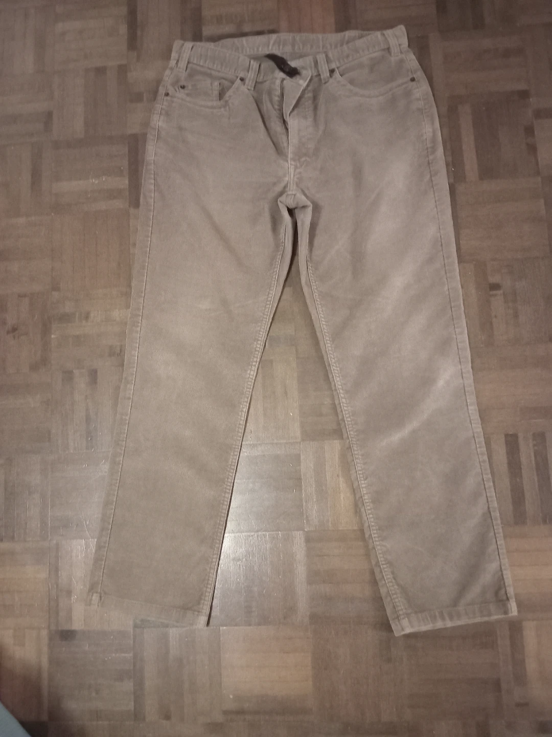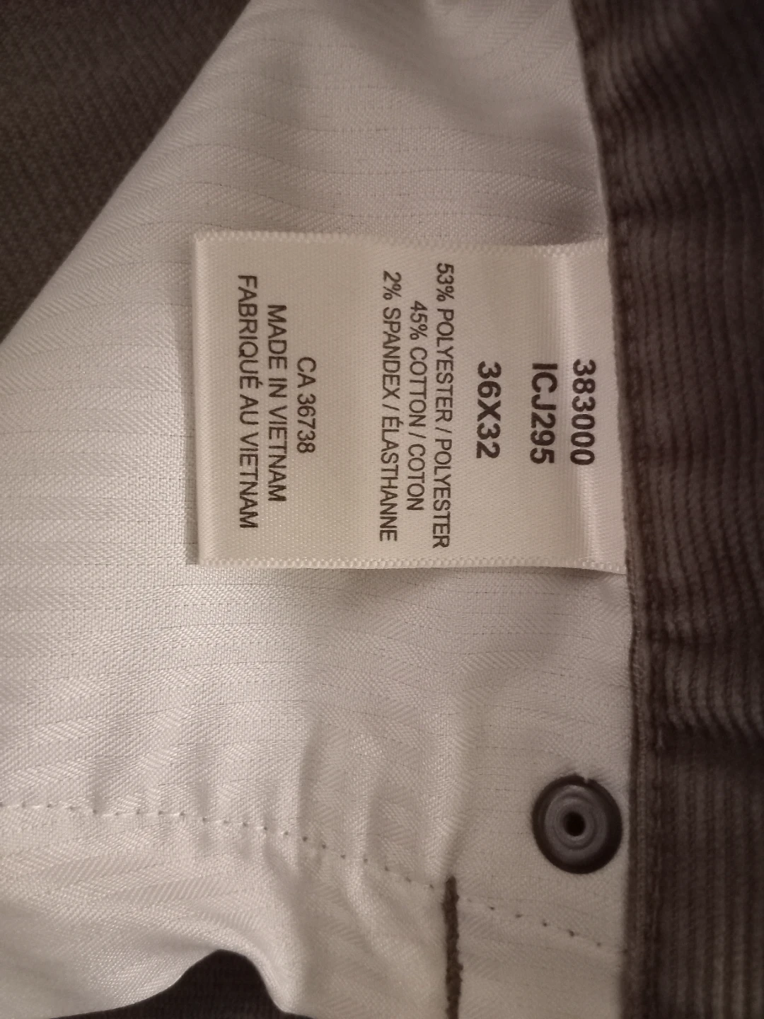 Selling a pair of men's corduroy pants. They are size 36x32 and made of 53% polyester, 45% cotton, and 2% spandex/elastane. These pants were made in Vietnam.