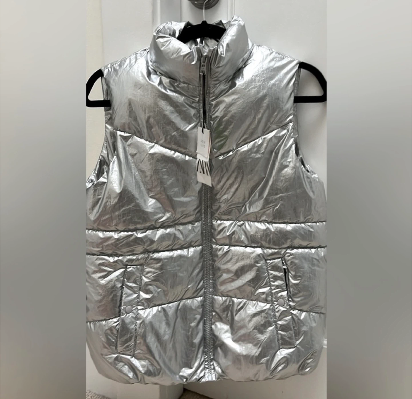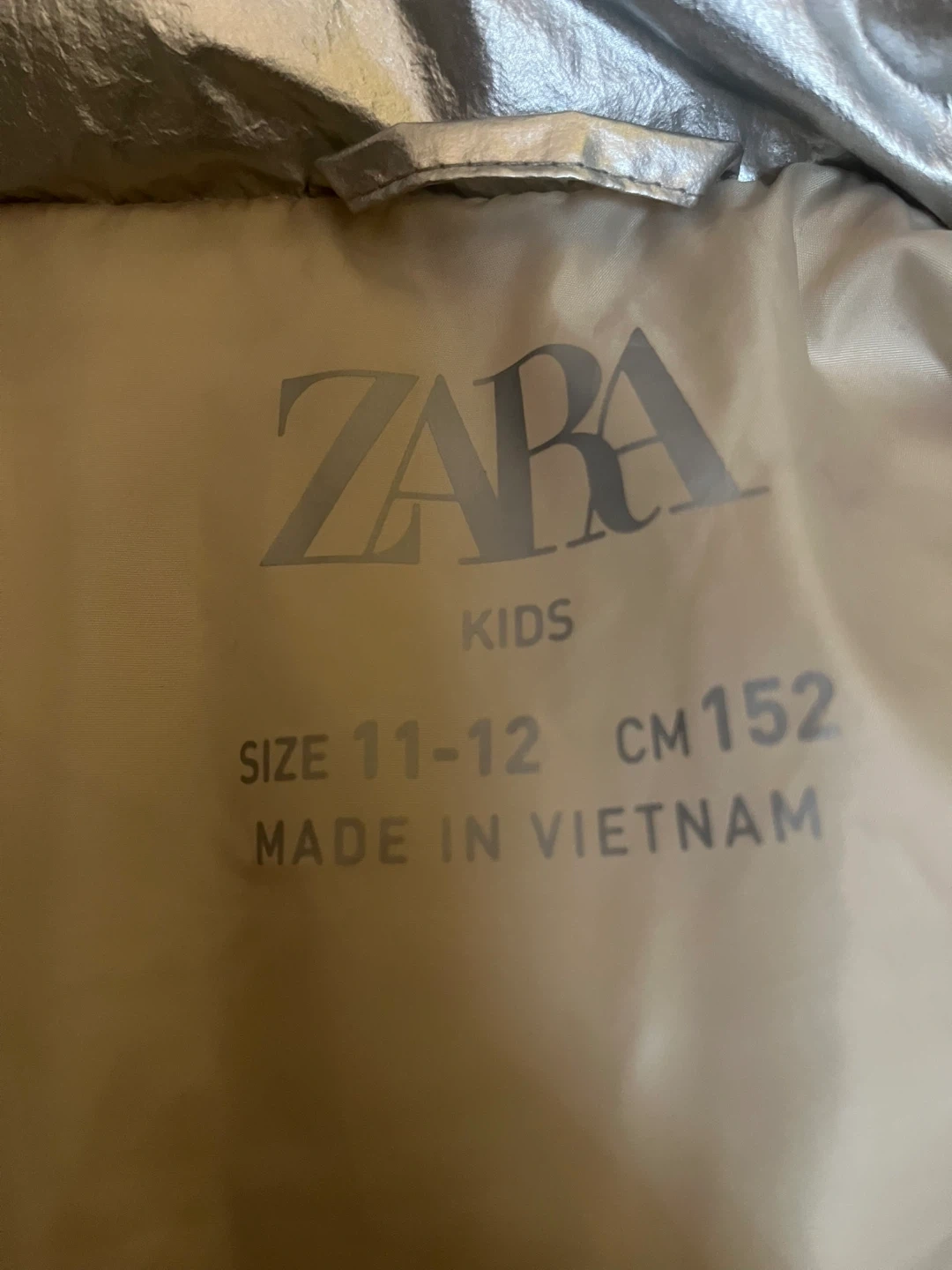 Selling a Zara Kids puffer vest in a shiny silver colour! It's a size 11-12 (CM 152). Perfect for layering and adding a bit of sparkle to any outfit